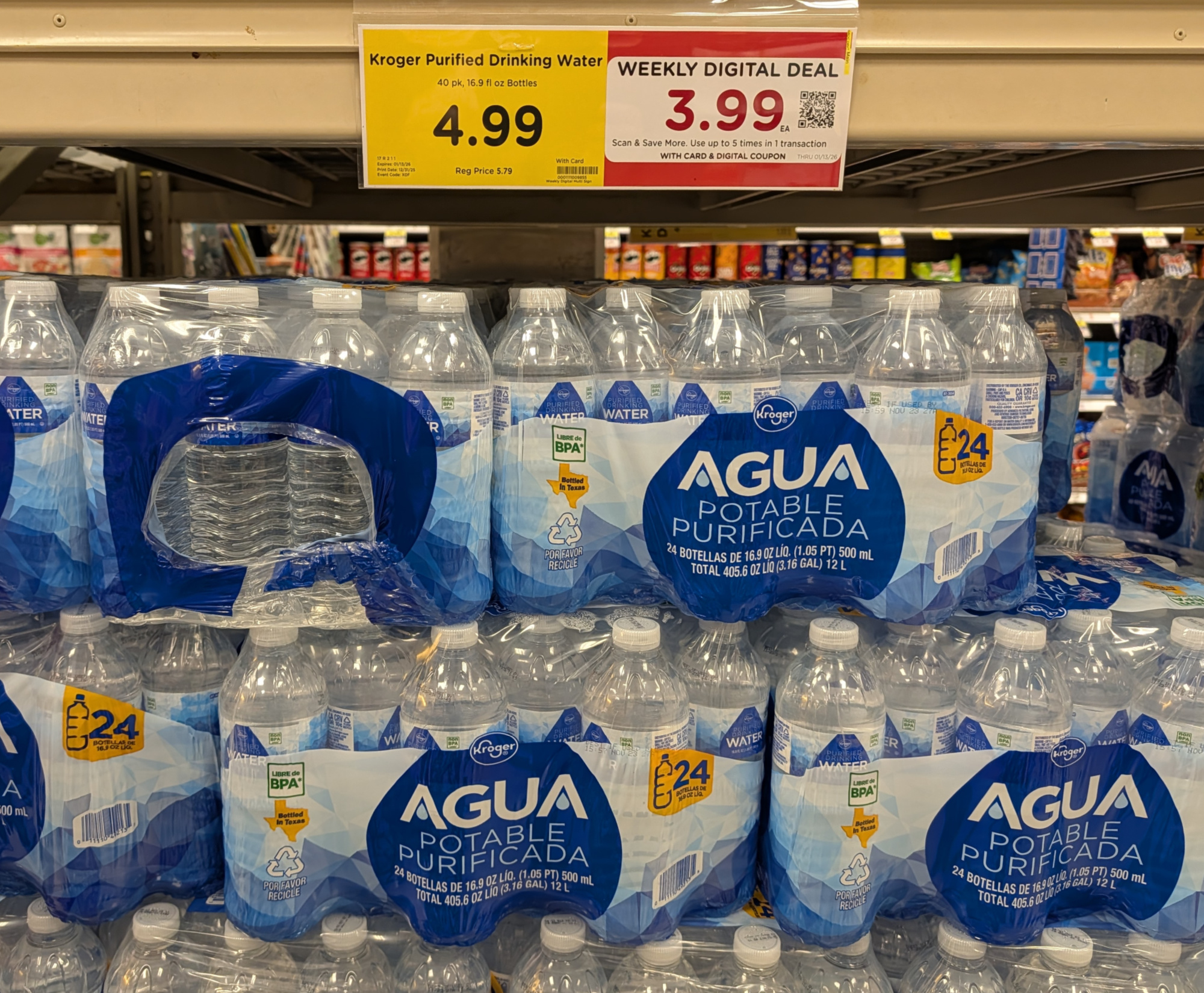 Pick up a nice deal on water this week at Kroger. Grab the 40-packs of Kroger Purified Drinking Water for just $3.99 with the digital coupon.