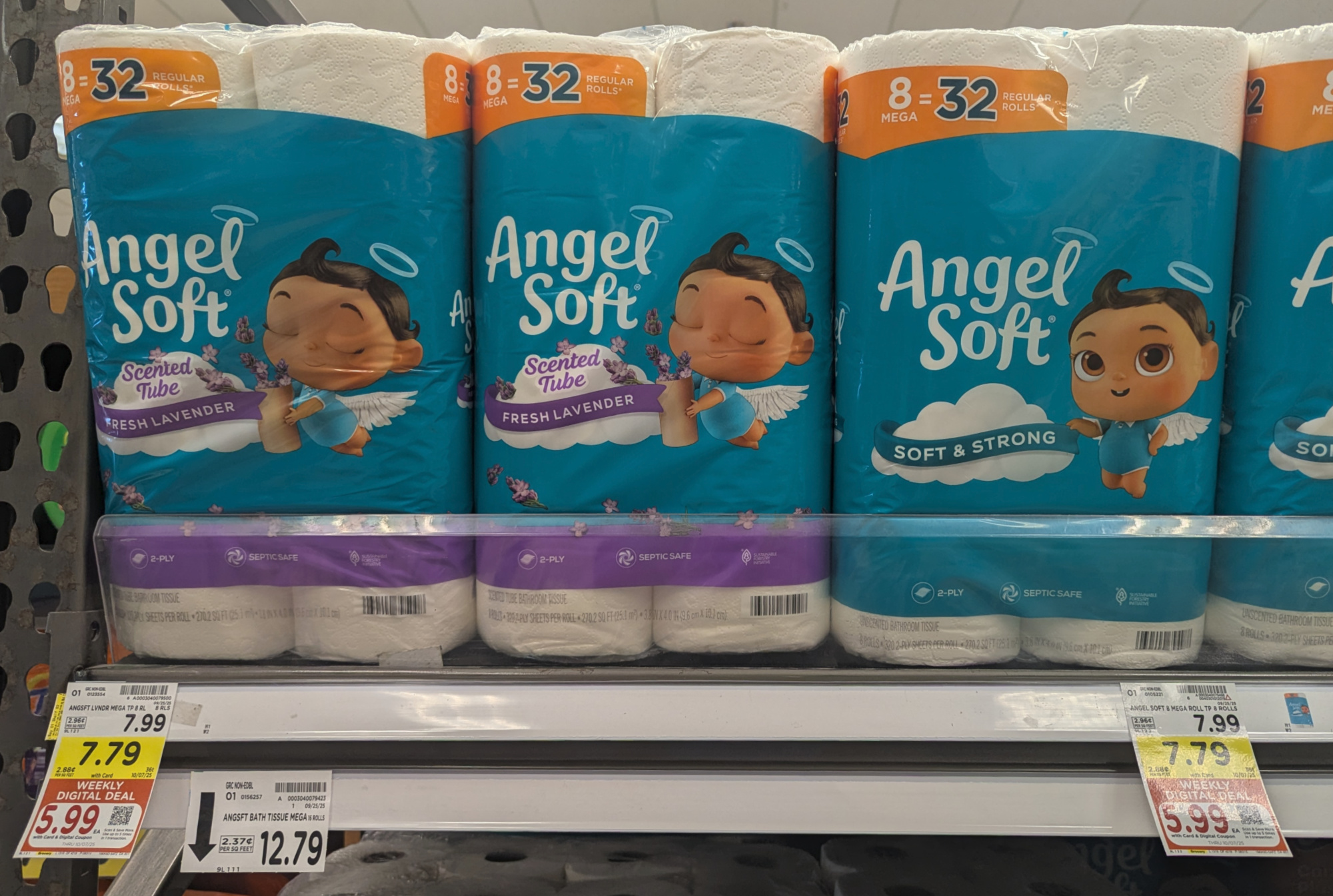 –$1.80/1 Angel Soft Bath Tissue, 8 Mega Rolls, Kroger Super Saver Digital Coupon (use up to 5 times in a single transaction)