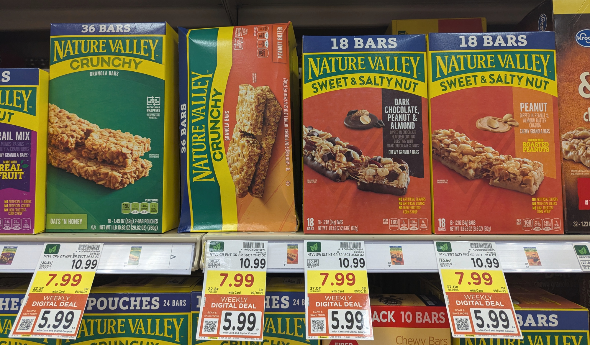 Pick up a nice deal on Nature Valley Granola Bars at Kroger. With the sale and coupon , you can get the BIG boxes for as little as $5.99 each. Stock up and get up to FIVE varieties at that price.
