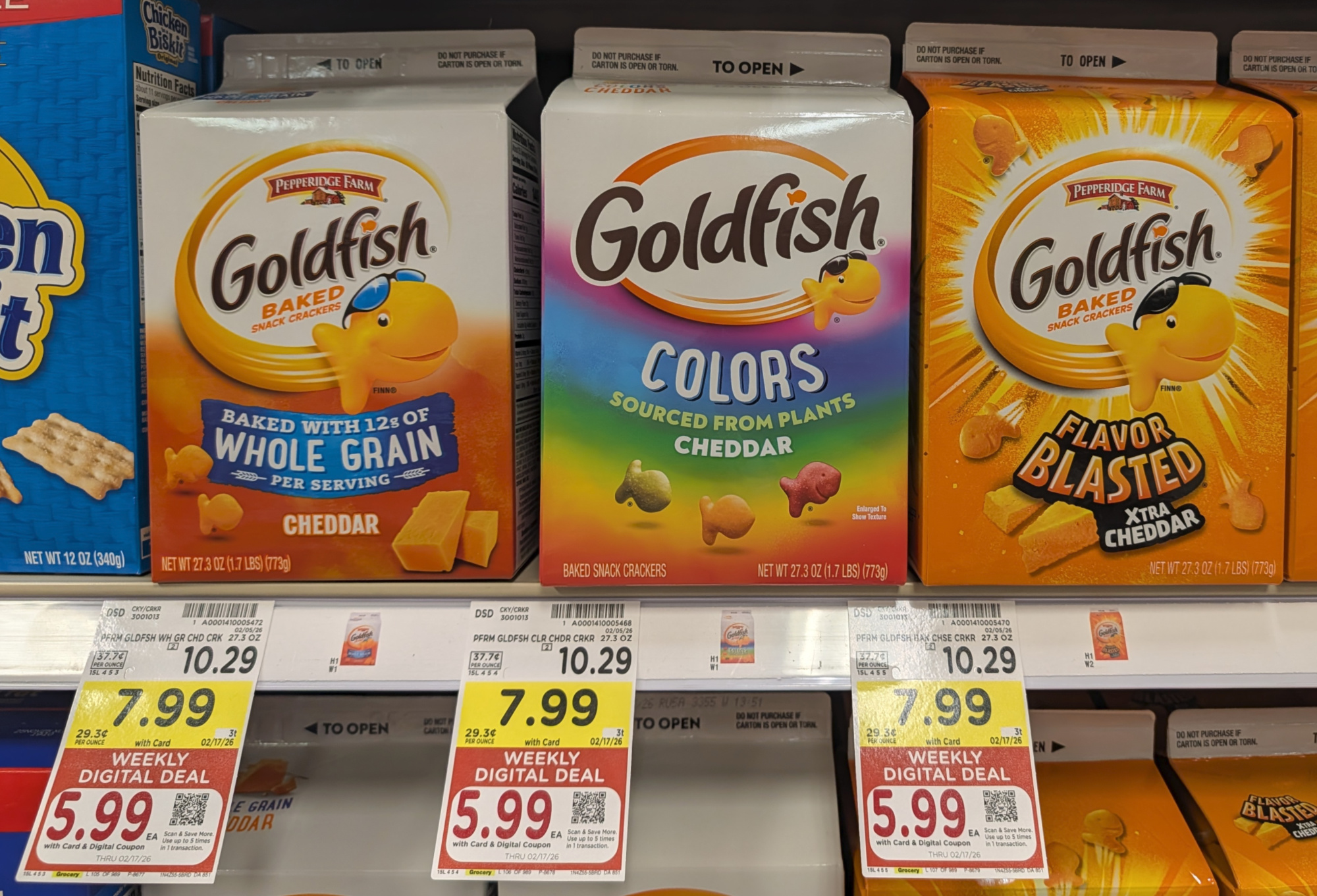 –$2/1 Pepperidge Farm Goldfish Crackers, 30 oz, Kroger Super Saver Digital Coupon (use up to 5 times in a single transaction)
