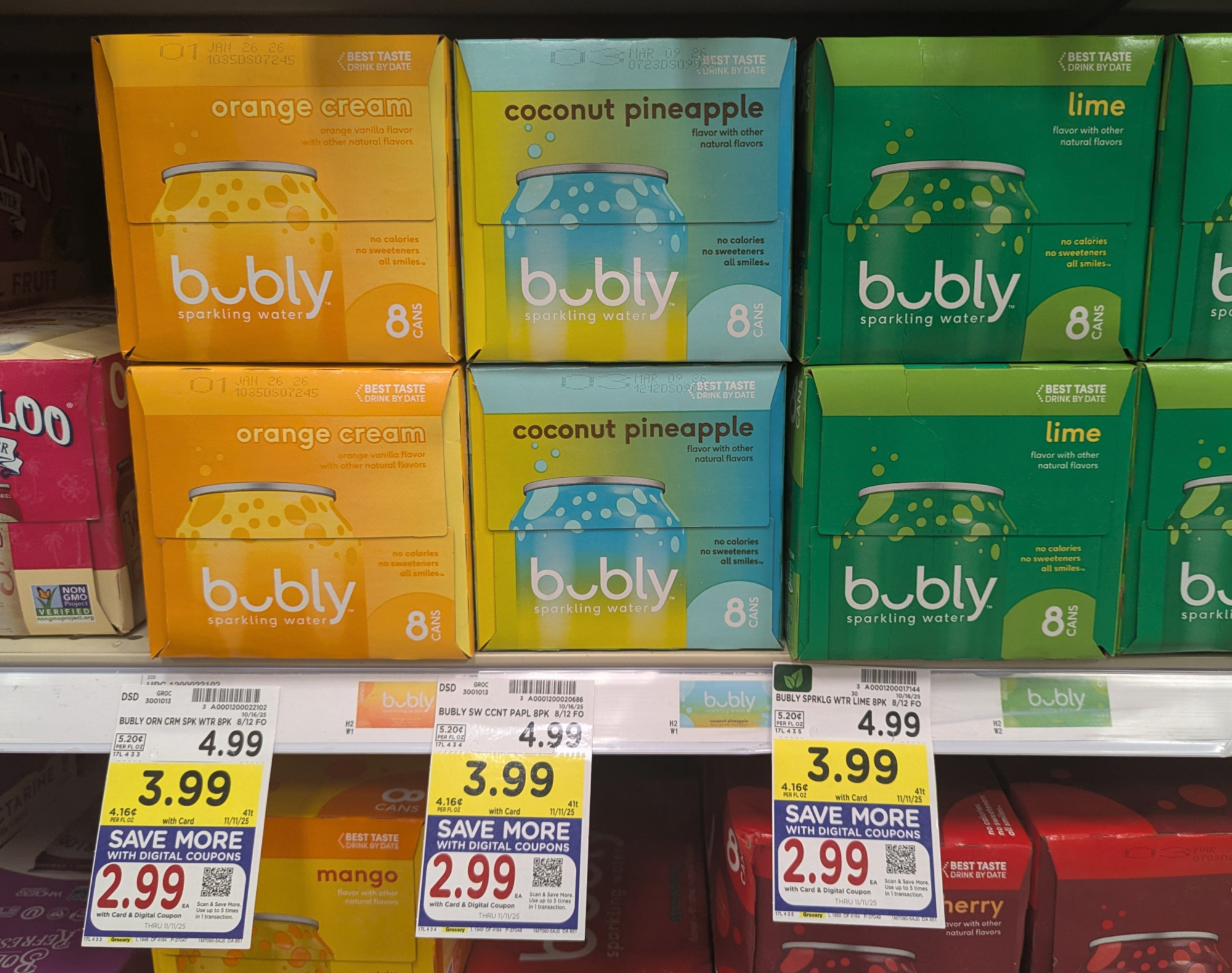 –$1/1 Bubly Sparkling Water, 8-pk, 12 oz cans, Kroger Super Saver Digital Coupon (use up to 5 times in a single transaction)