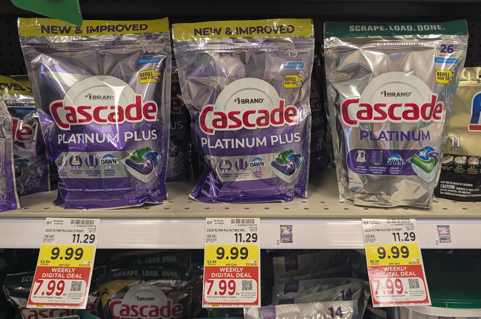 Make cleaning dishes a breeze. Kroger has packages of Cascade Cascade Platinum Plus Actionpacs for just $7.99 when you combine the sale and coupon.