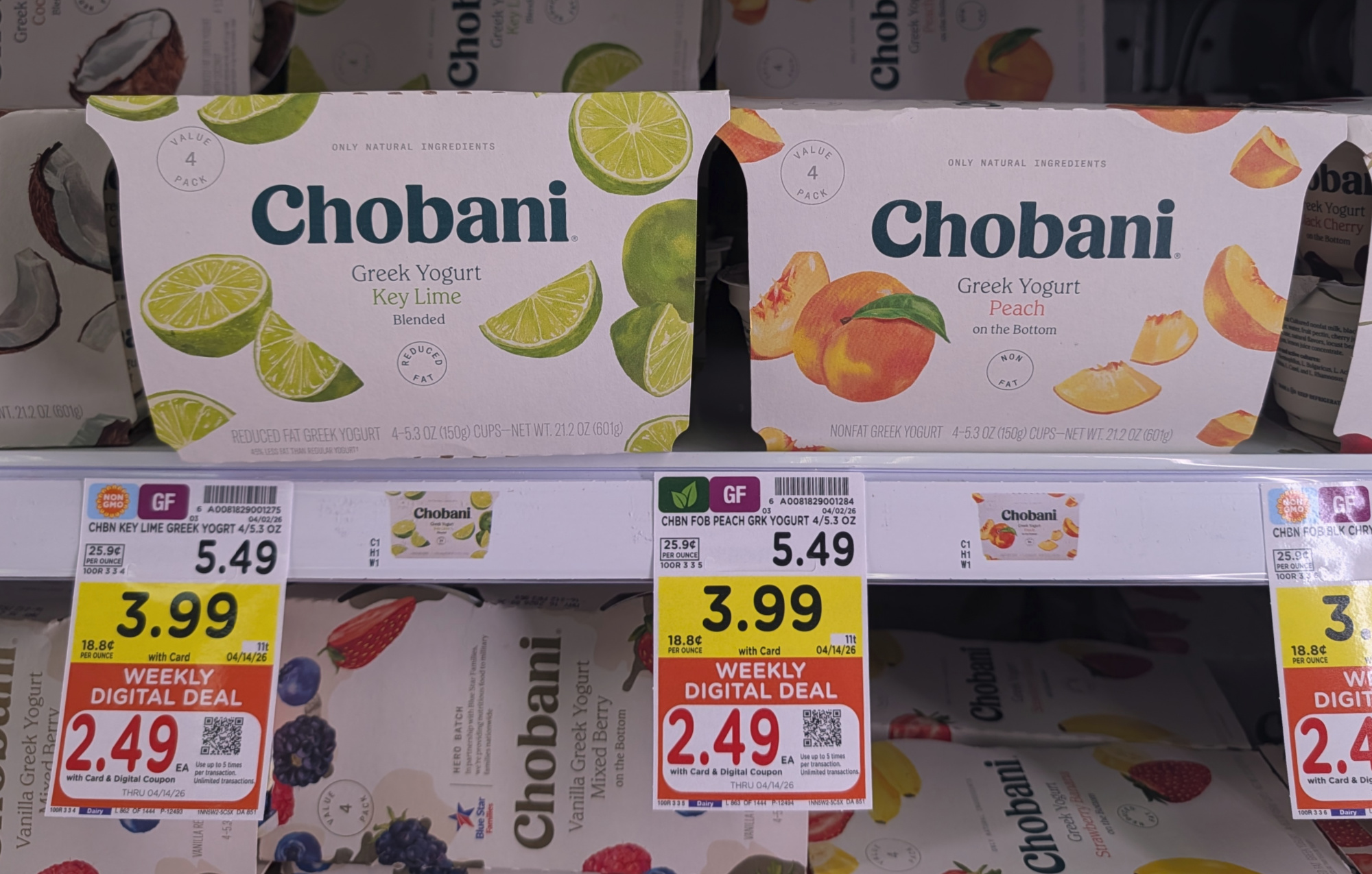 After discounts you can get the 4-packs of Chobani Greek Yogurt for as little as $2.49 each with the Kroger Digital Coupon. That comes out to about 62¢ per cup.