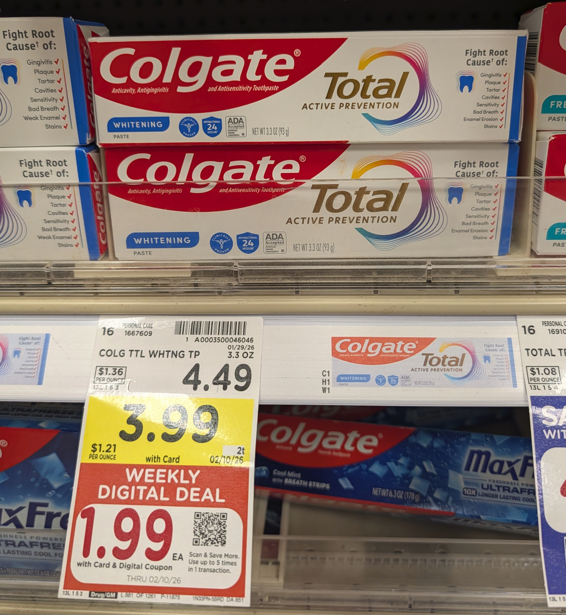 $2/1 Colgate Total Toothpaste (3.3 oz), Kroger Super Saver Digital Coupon (use up to 5 times in a single transaction)