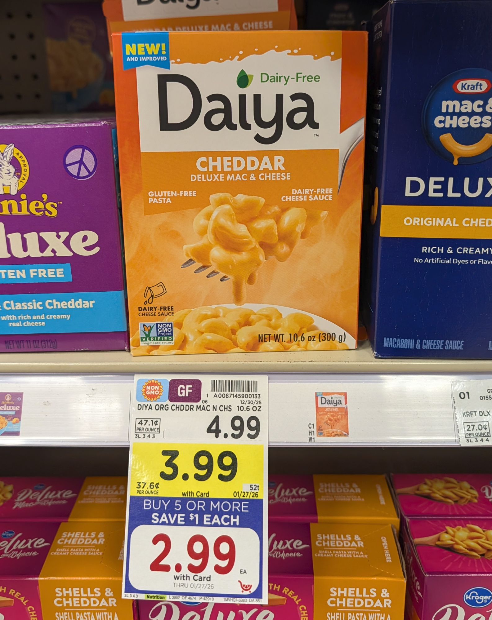 You can pick up Daiya Dairy-Free Deluxe Mac & Cheese at a super discount. Grab the boxes for just $1.49 after the sale and cash back combo.