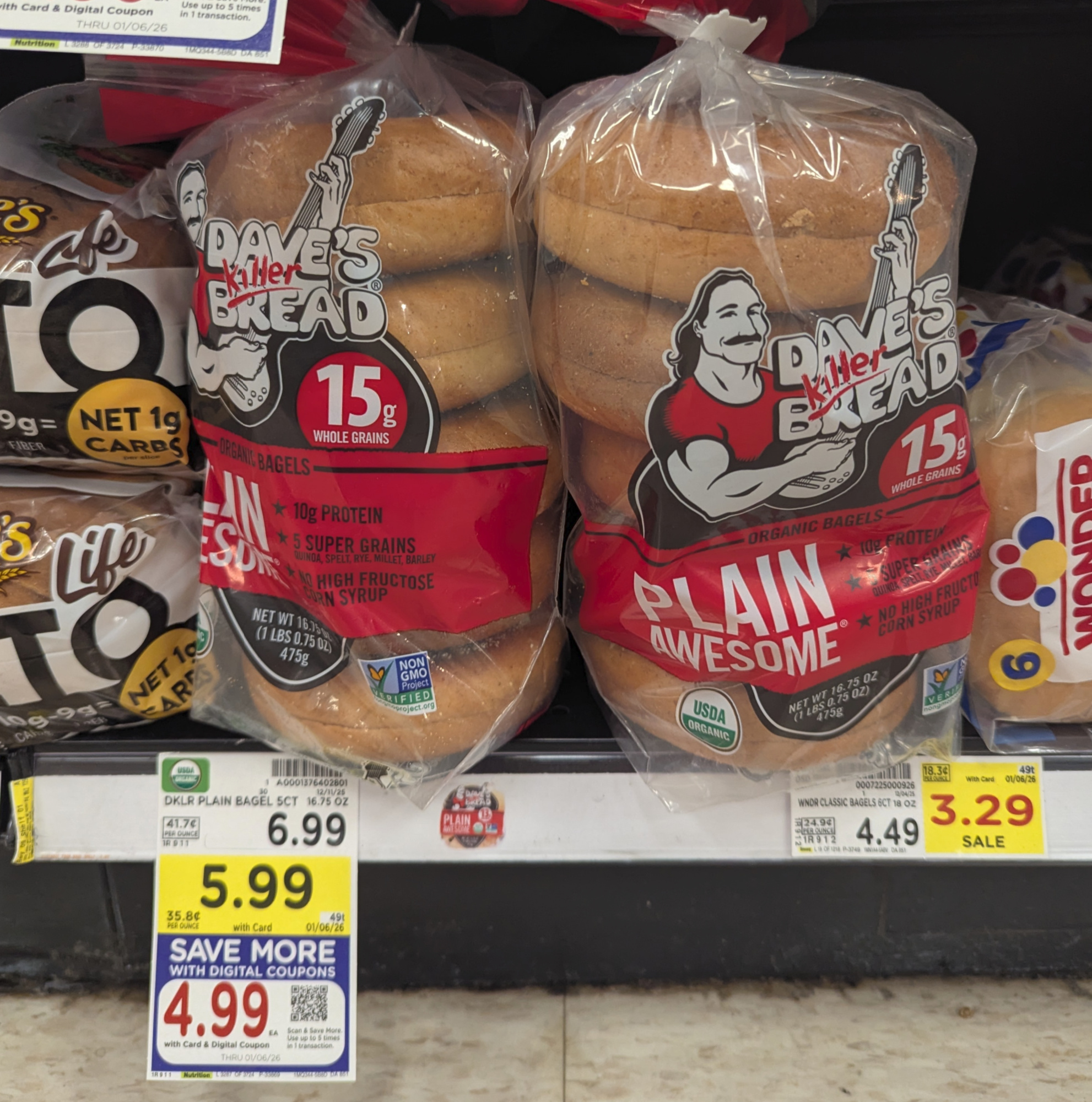 $1/1 Dave’s Killer Bread Organic Bagels, 5 ct, Kroger Super Saver Digital Coupon (use up to 5 times in a single transaction)