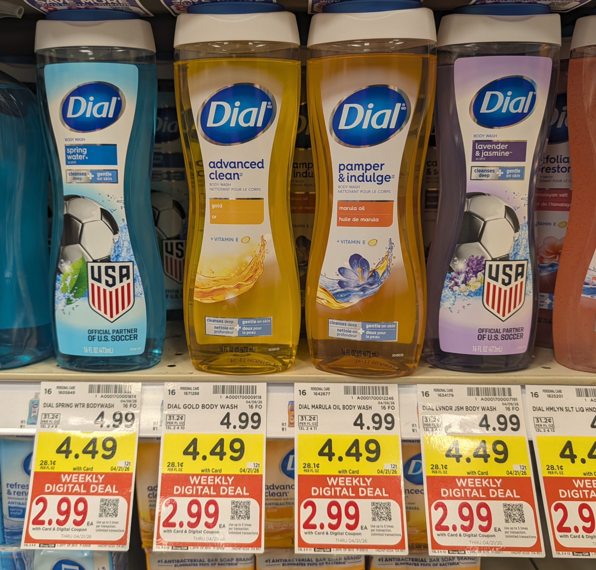 –$1.50/1 Dial Body Wash, 16 oz, Kroger Super Saver Digital Coupon (use up to 5 times in a single transaction)