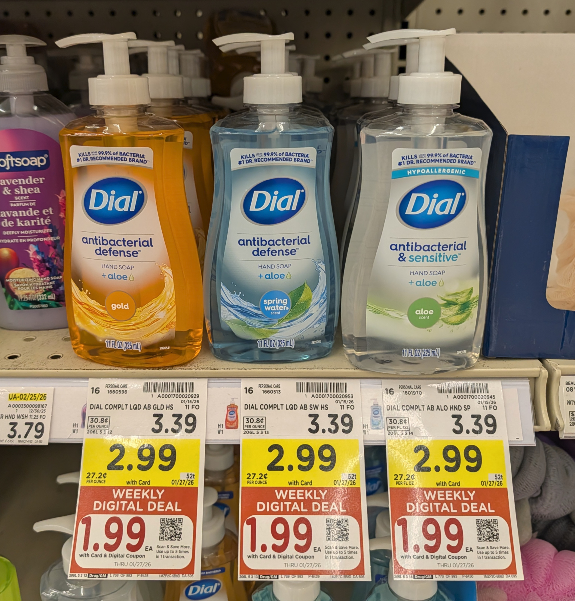 –$1/1 Dial Liquid Hand Soap, or Foaming Hand Wash, 7.5 to 11 oz, Kroger Super Saver Digital Coupon (use up to 5 times in a single transaction)