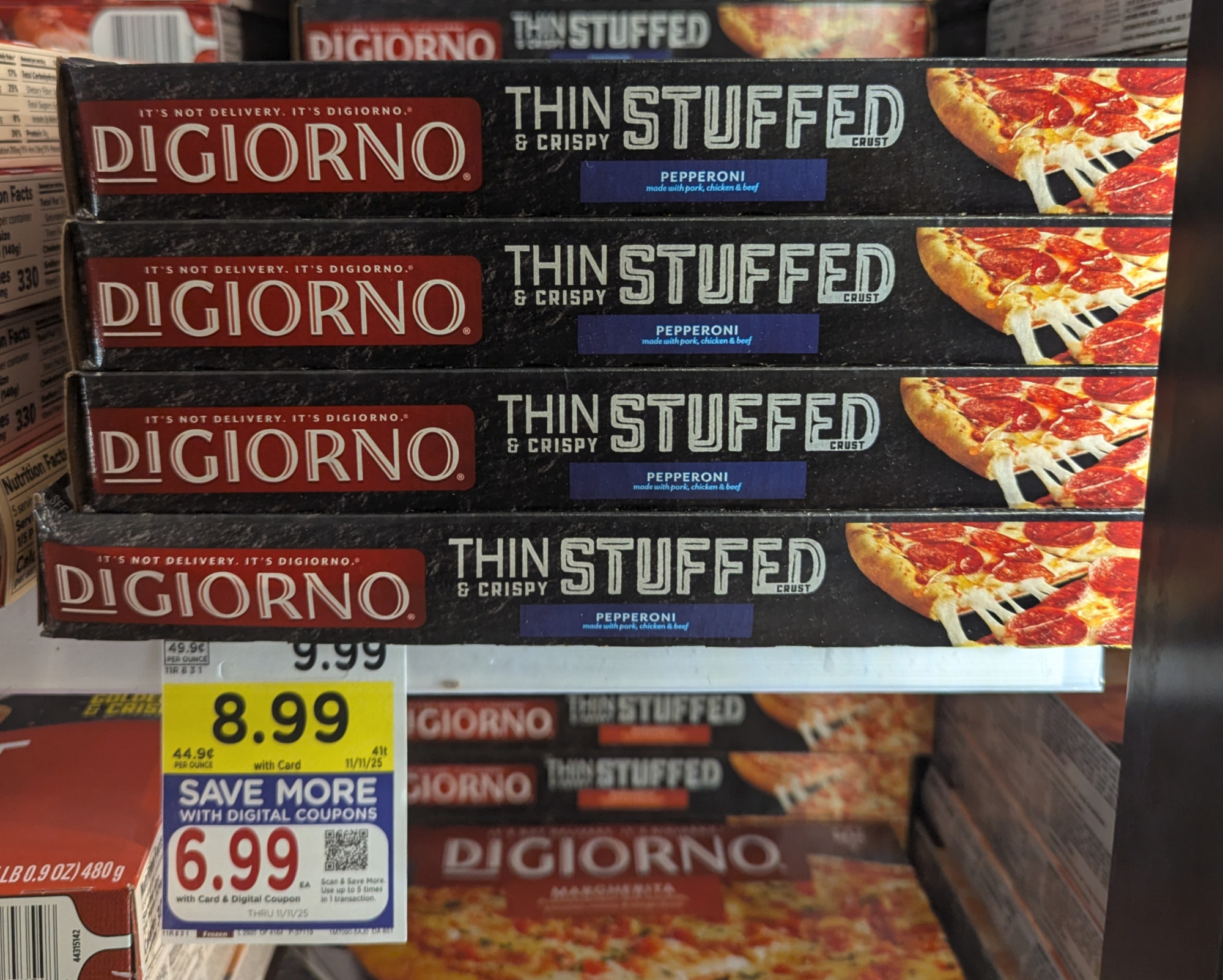 Use the sale and digital coupon to get DiGiorno Thin & Crispy Stuffed Crust Pizza, or Detroit Style Pizza for as little as $6.99 right now at Kroger. Sounds like the makings of a cheap pizza night… without any delivery fees!