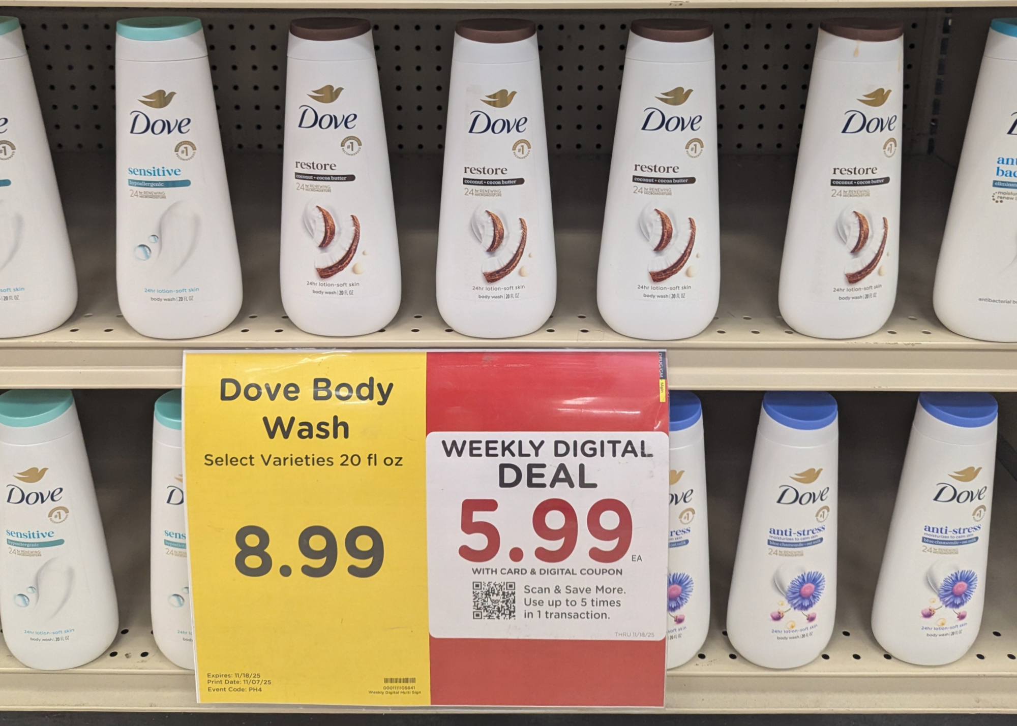 Get to Kroger for a super deal on Dove products. You can get body wash for as little as $5.99 with the digital coupon.