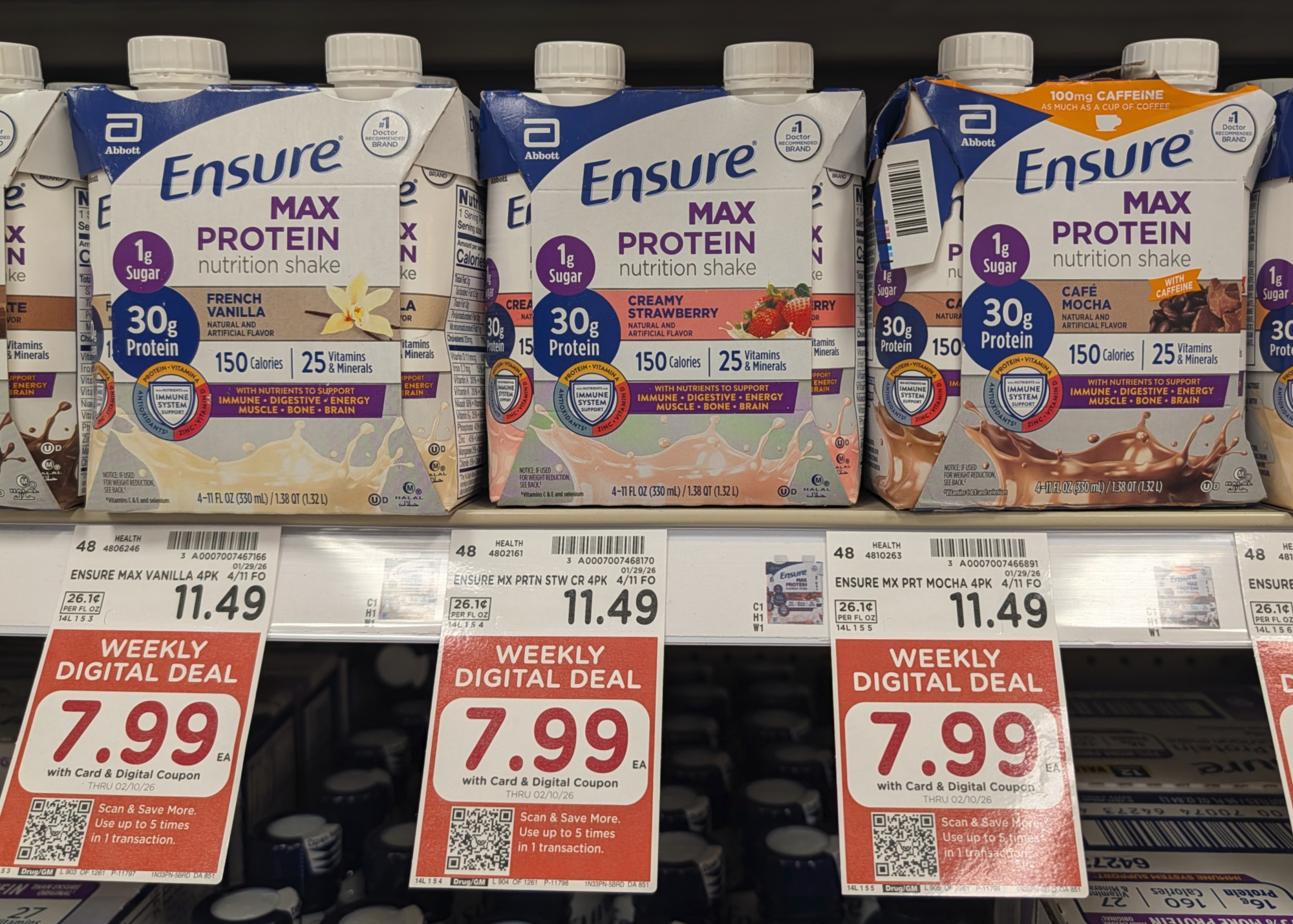 Head over to Kroger for a nice deal on Ensure Multipacks. Get up to five flavors for just $7.99 per pack with the digital coupon.