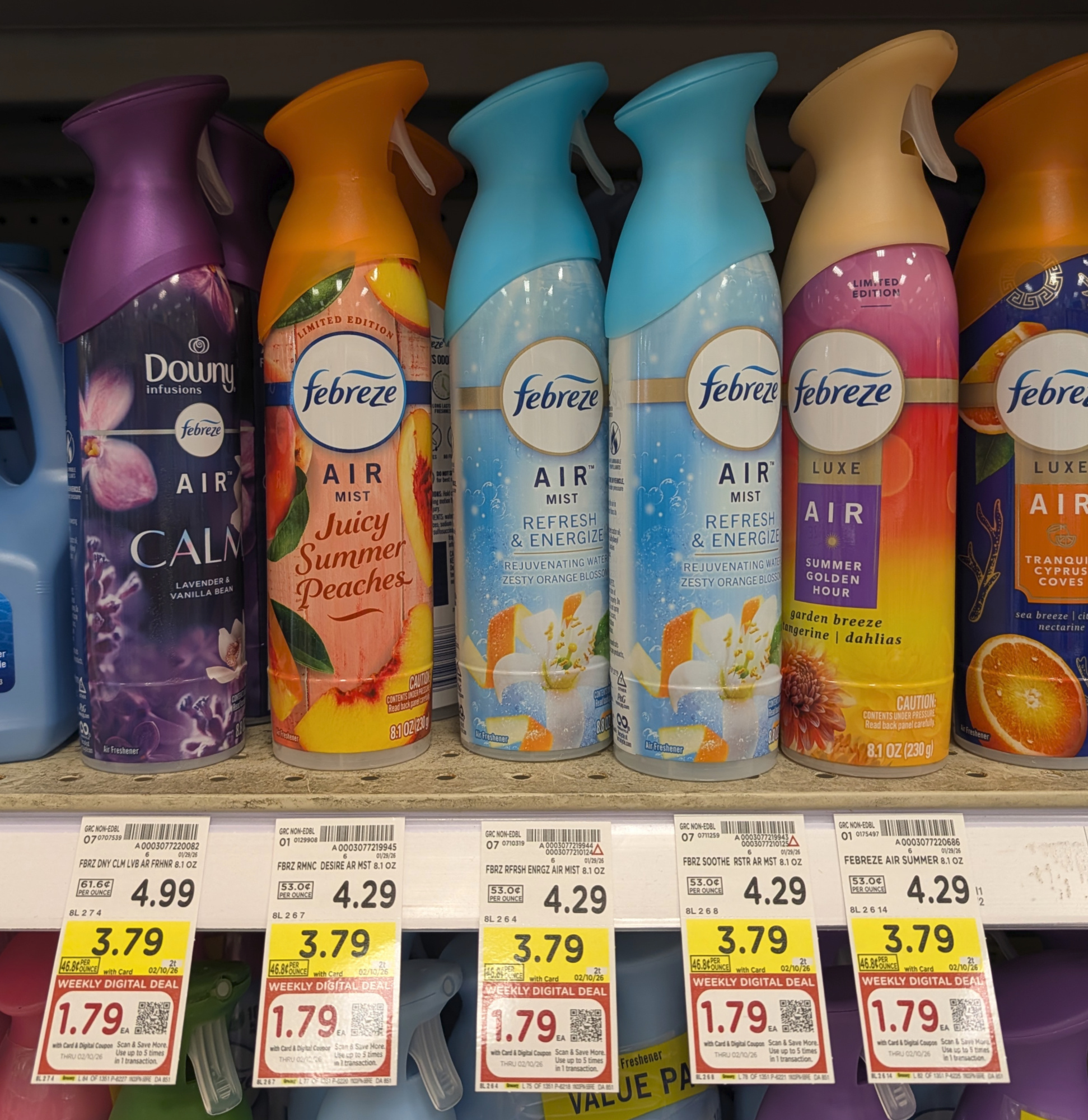 Stock up on Febreze Air Effects at a huge discount with the sale and coupon at Kroger. Grab the cans for just $1.79 each the next time you shop. Get up to FIVE of your favorite scents at that price.
