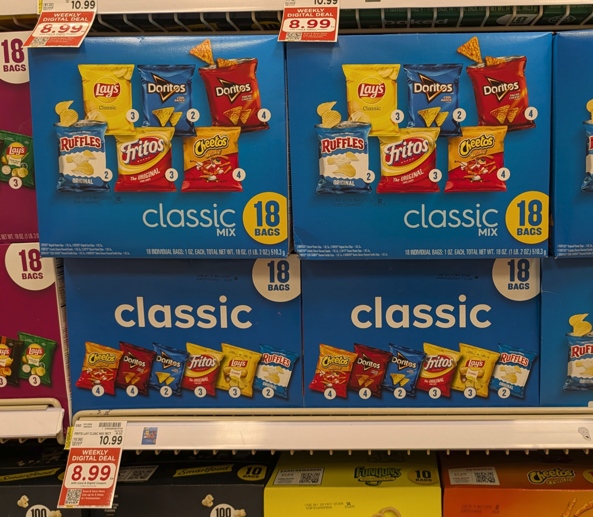 Get the big Frito-Lay Multipack 18-count boxes for just $8.99 at Kroger with the digital coupon. That comes out to just 50¢ per bag. Stock up if you need single-serve snacks for break time or the kids’ lunch boxes.