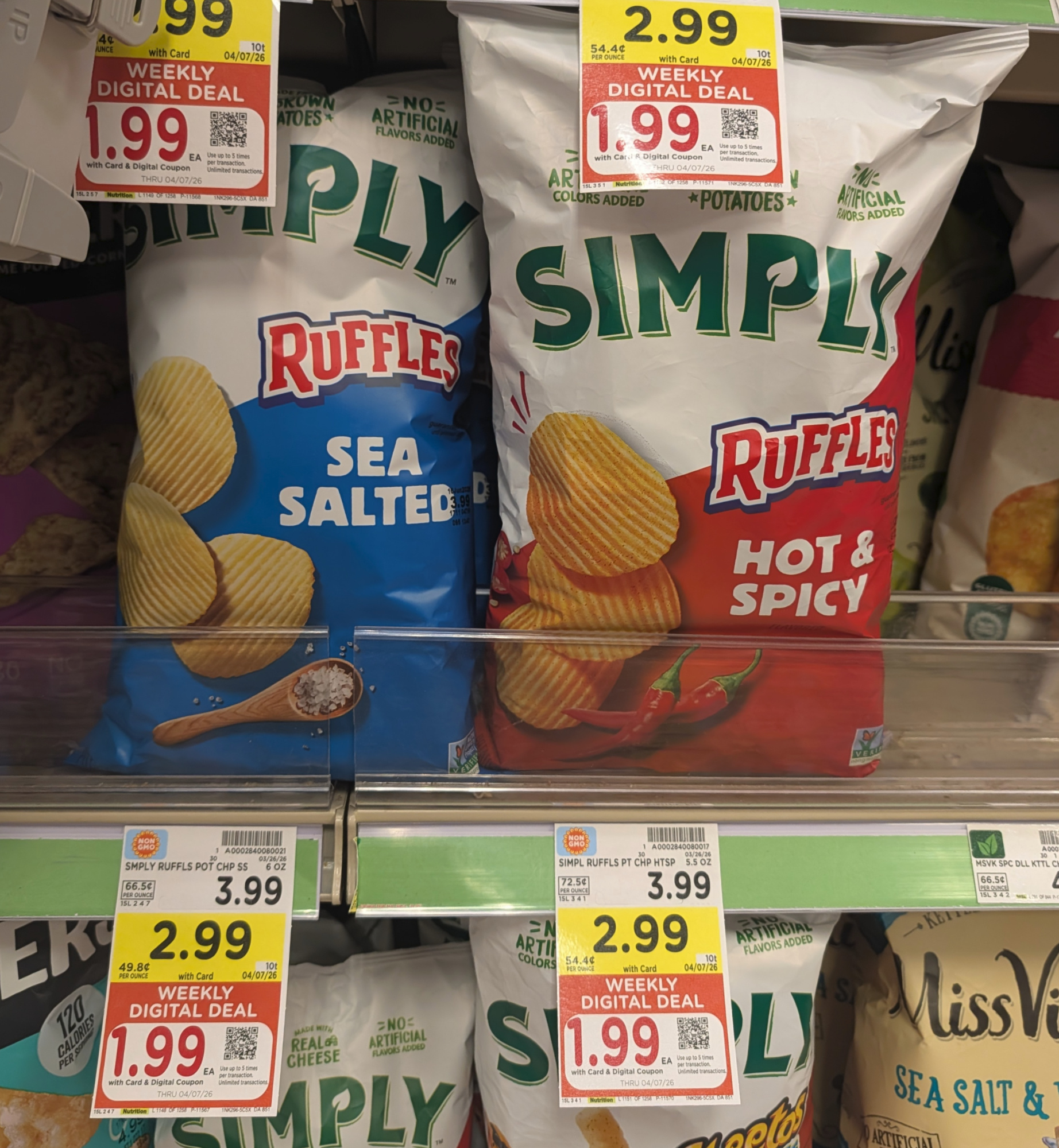 Get the bags of Frito-Lay Simply Snacks at a discount when you shop this week. The bags on sale with a digital coupon to pair up for even more savings! Grab up to FIVE bags for just $1.99 at Kroger.