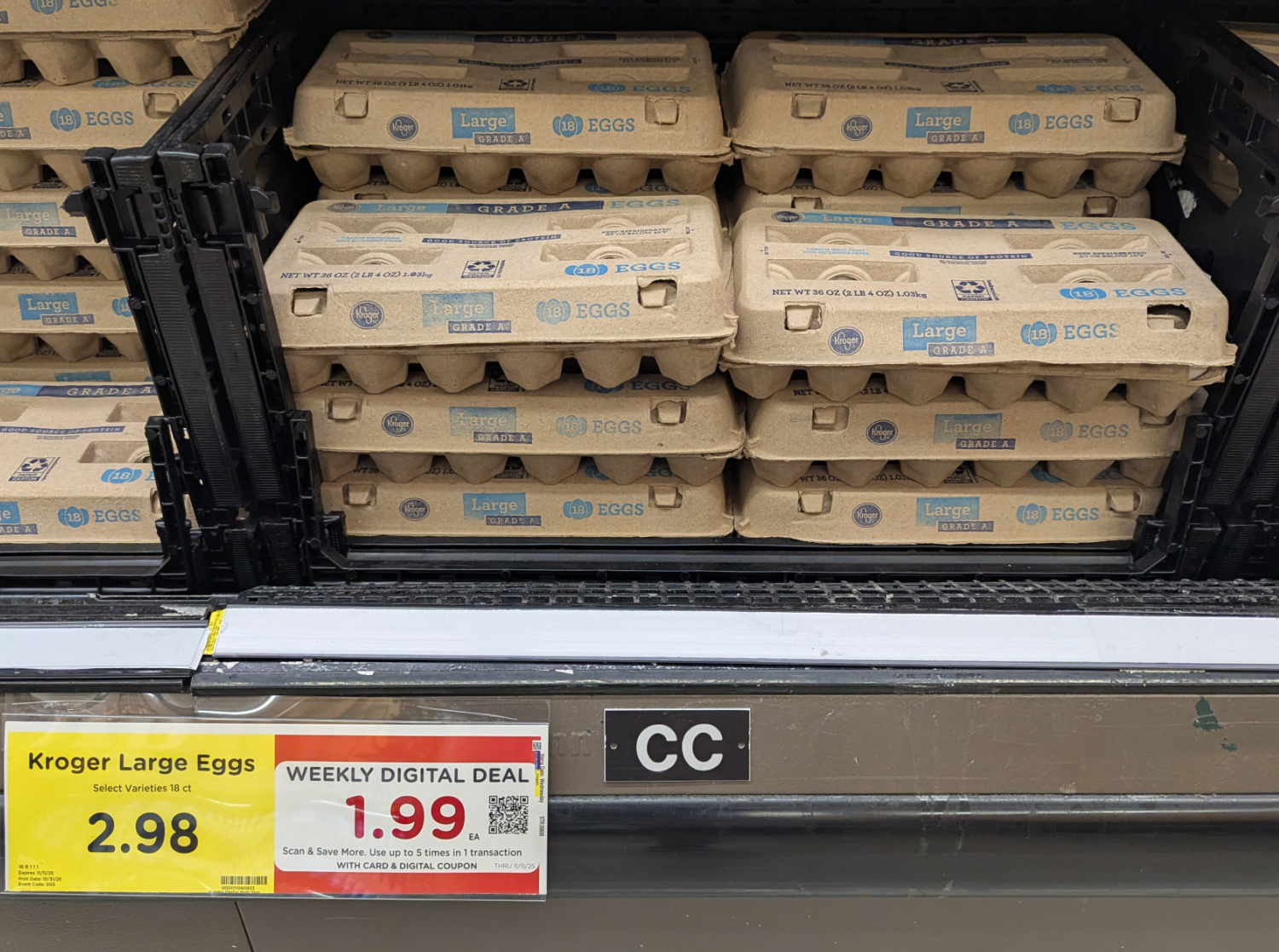 $2.30/1 Kroger Eggs, Large, 18 ct, Kroger Super Saver Digital Coupon (use up to 5 times in a single transaction)