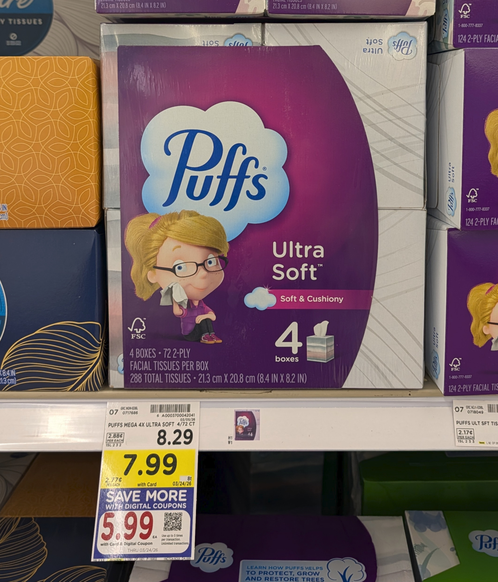 –$2/1 Puffs Facial Tissues, 4-pk, Kroger Super Saver Digital Coupon (use up to 5 times in a single transaction)