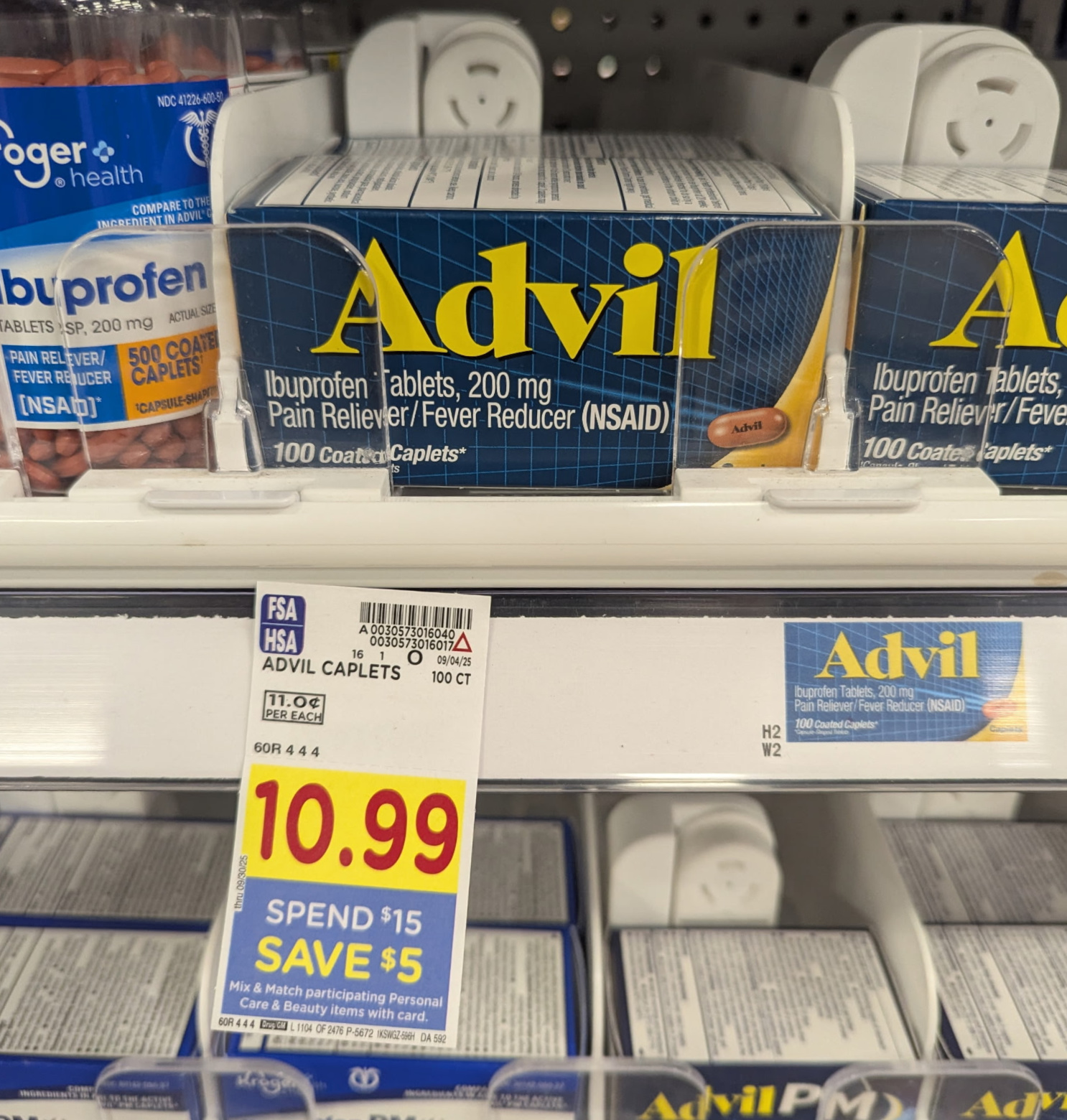 Head over to Kroger to get a discount on Advil pain meds. After discounts, you can pick up the 100-count bottles for just $6.49 each.