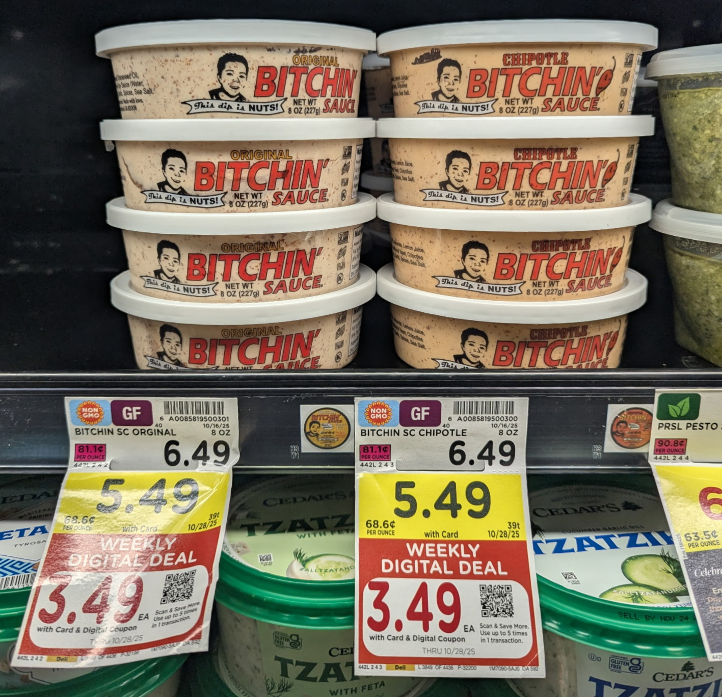 Head over to Kroger and pick up the tubs of Bitchin’ Sauce for a great price. After the digital coupon you pay just $3.49 per container.