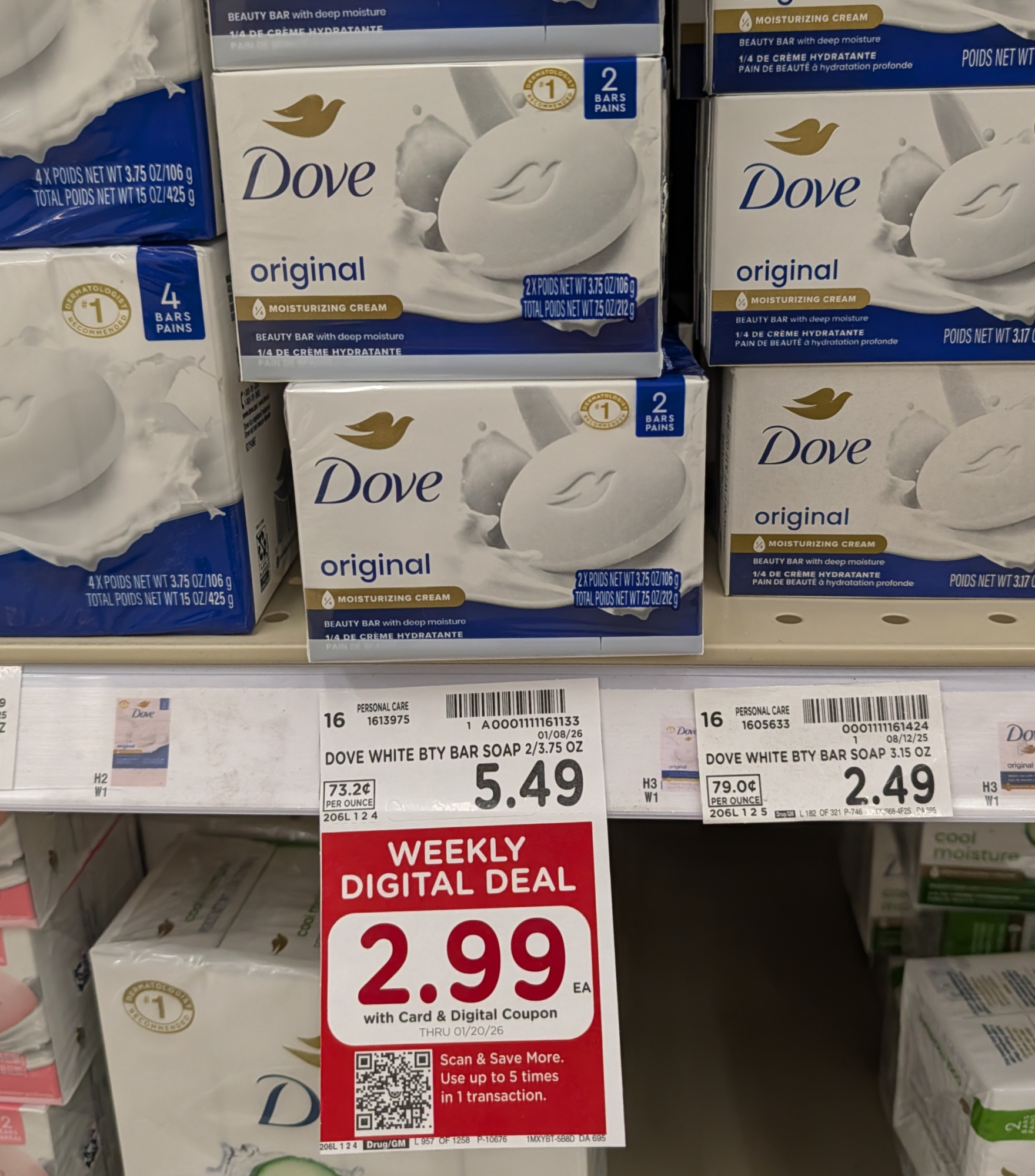 –$2.50/1 Dove Bar Soap, 2 ct, Kroger Super Saver Digital Coupon (use up to 5 times in a single transaction)
