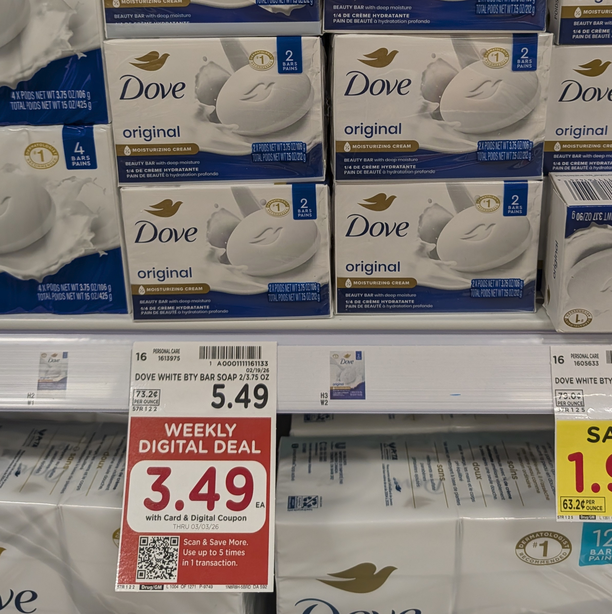 Load the Kroger digital coupon to get boxes of Dove Bar Soap for just $3.49 each. With two bars in each box, that comes out to just $1.75 per bar. Get up to FIVE boxes at a nice discount.