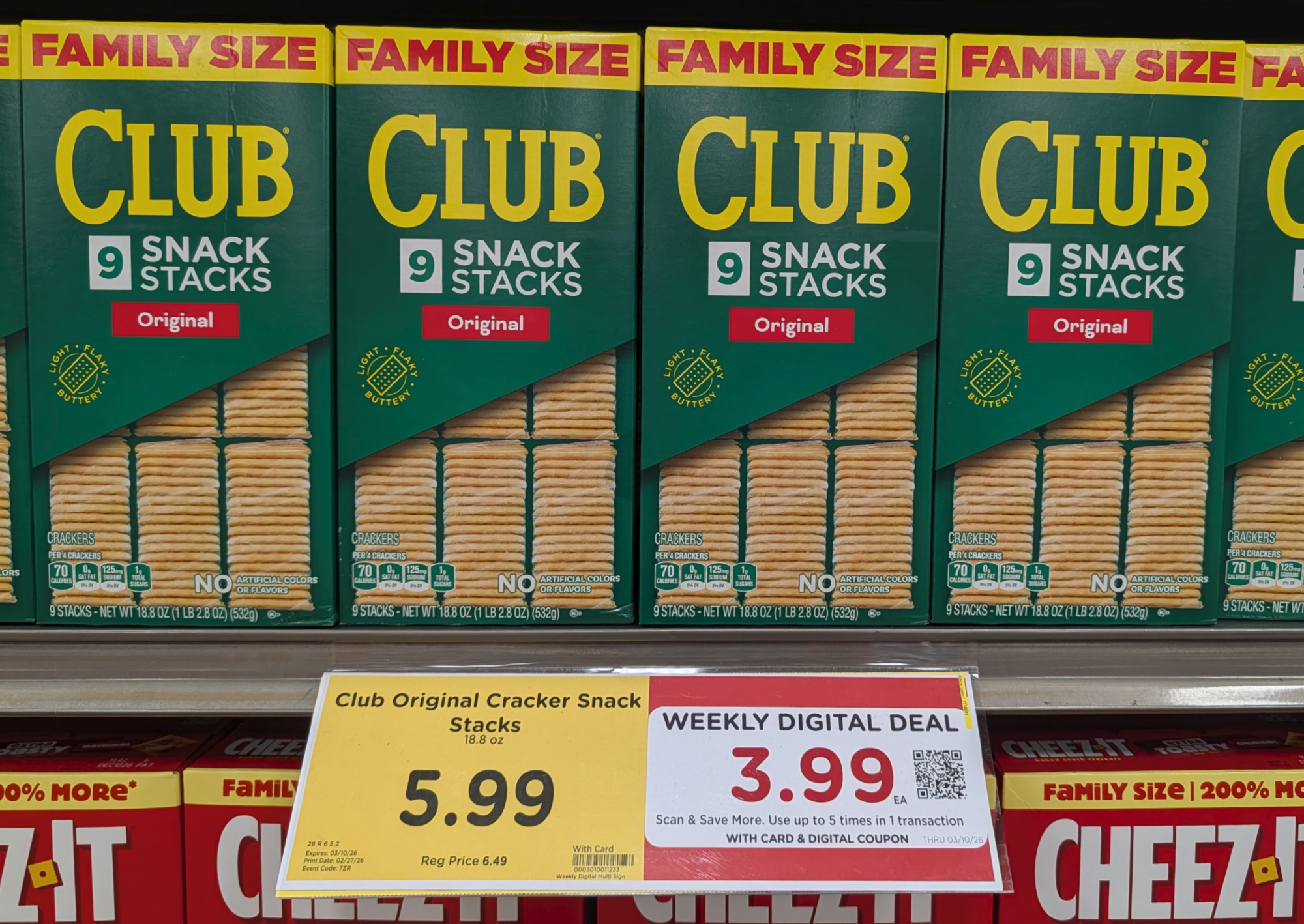 –$2/1 Cheez-It Family Size Crackers, 17 to 21 oz, or Club Family Size Crackers, 18.8 oz, Kroger Super Saver Digital Coupon (use up to 5 times in a single transaction)