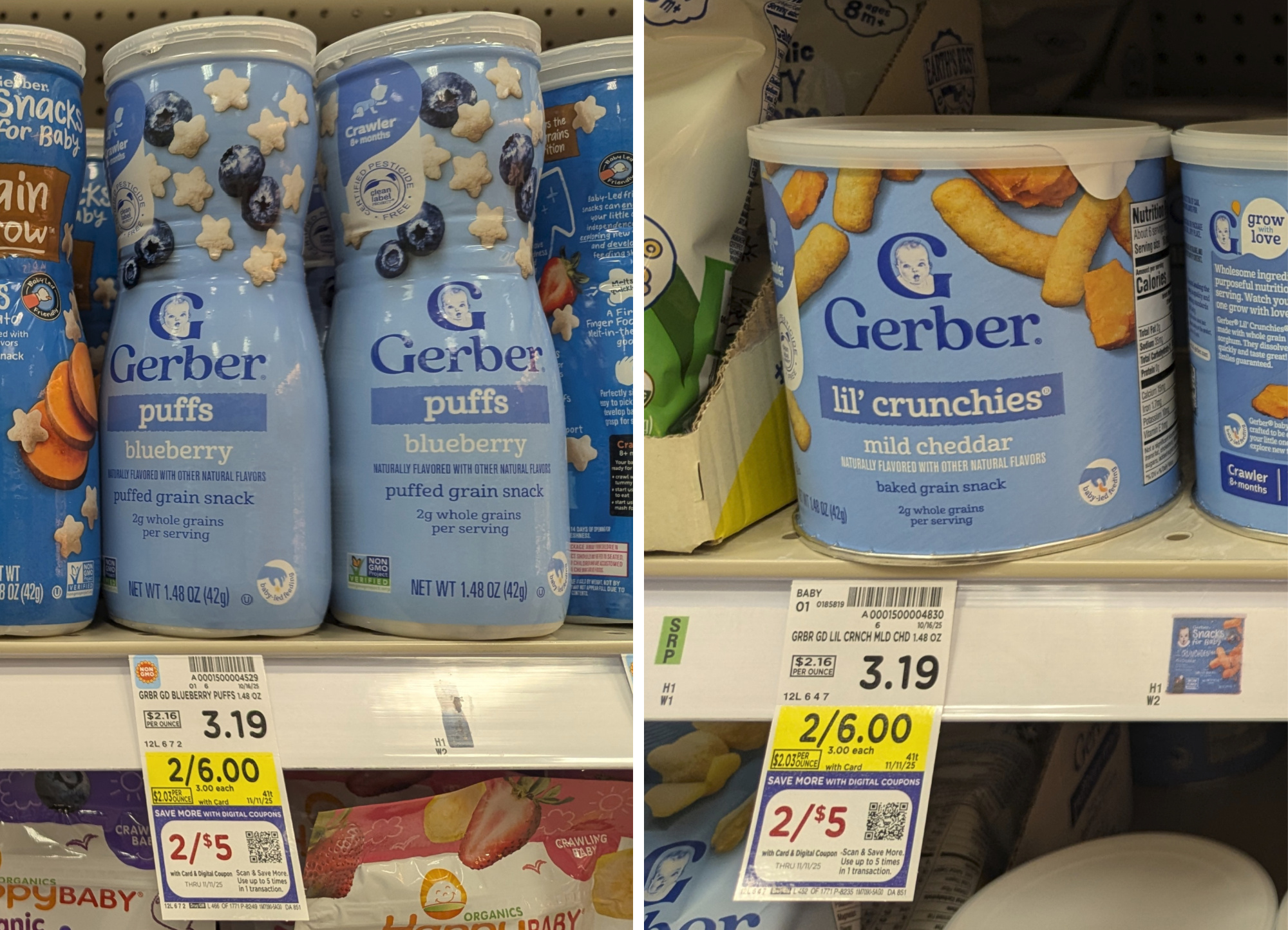 –$1/2 Gerber Puffs (1.48 oz), Kroger Super Saver Digital Coupon (use up to 5 times in a single transaction)