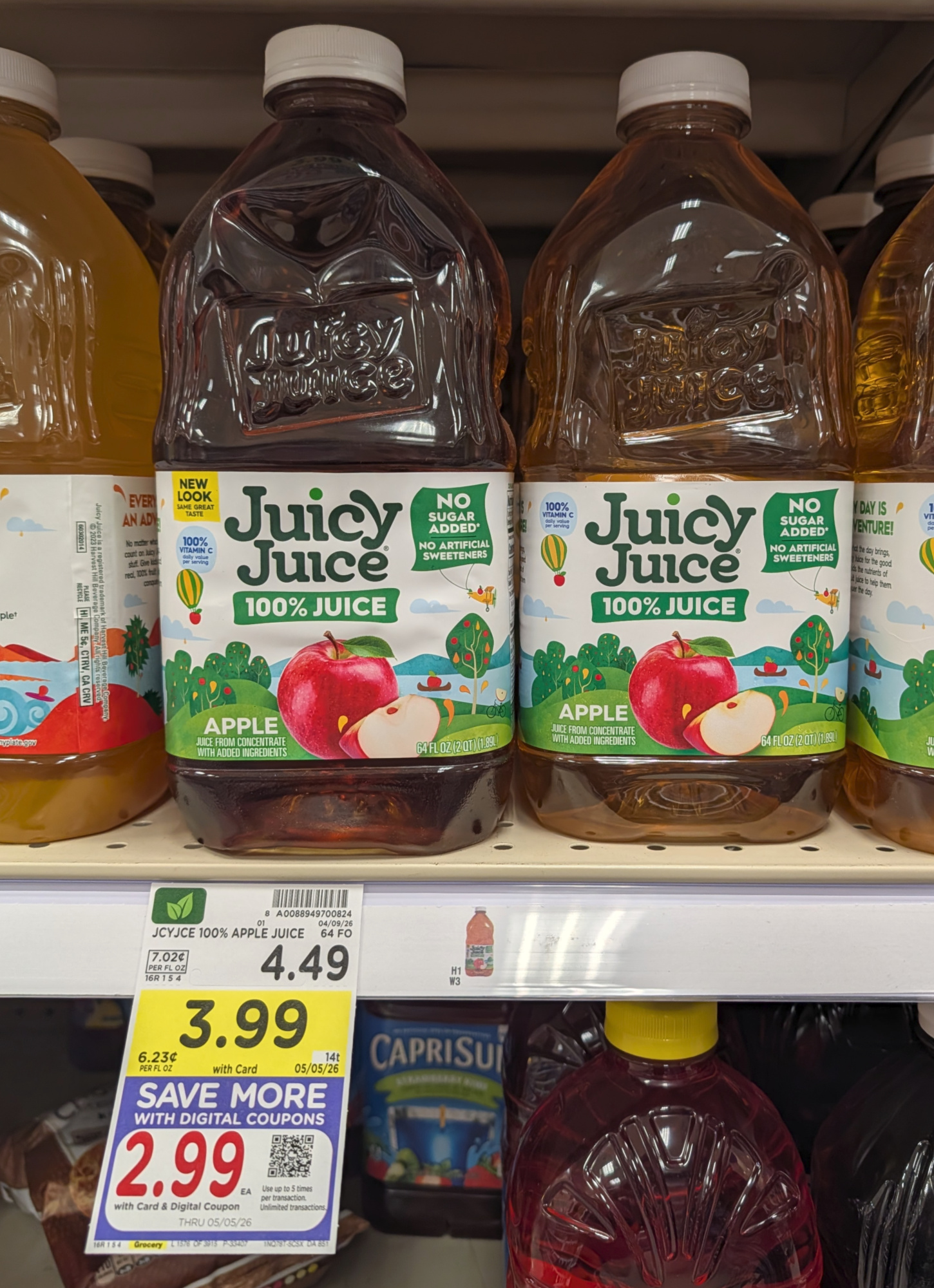 –$1/1 Juicy Juice 100% Juice, 64 oz, Kroger Super Saver Digital Coupon (use up to 5 times in a single transaction)