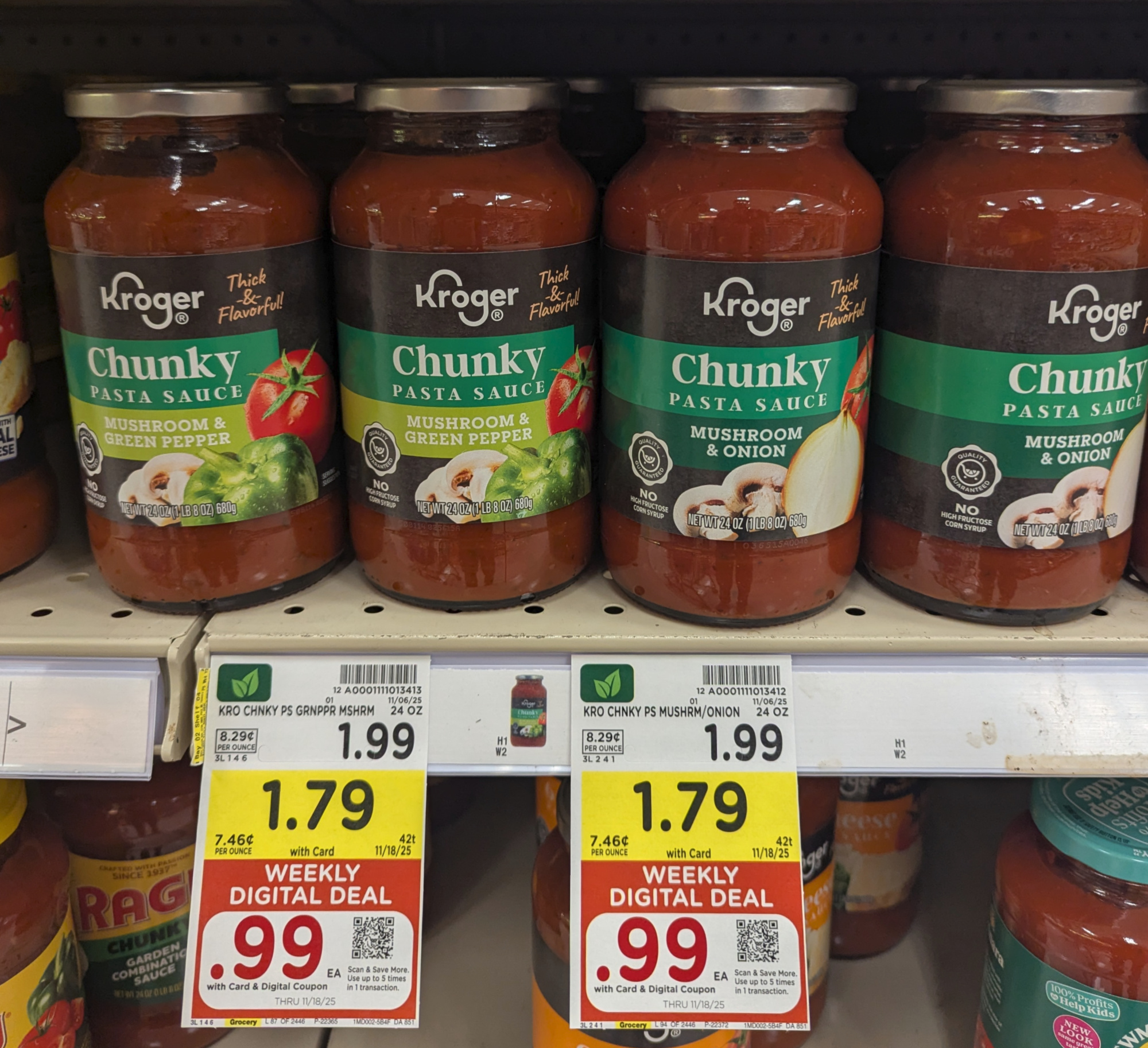 Pick up tasty pasta sauce at a fantastic price this week at Kroger. Clip your Kroger Pasta Sauce digital coupon to get the jars for just 99¢ each the next time you shop. Stock up for a quick meal on the cheap!