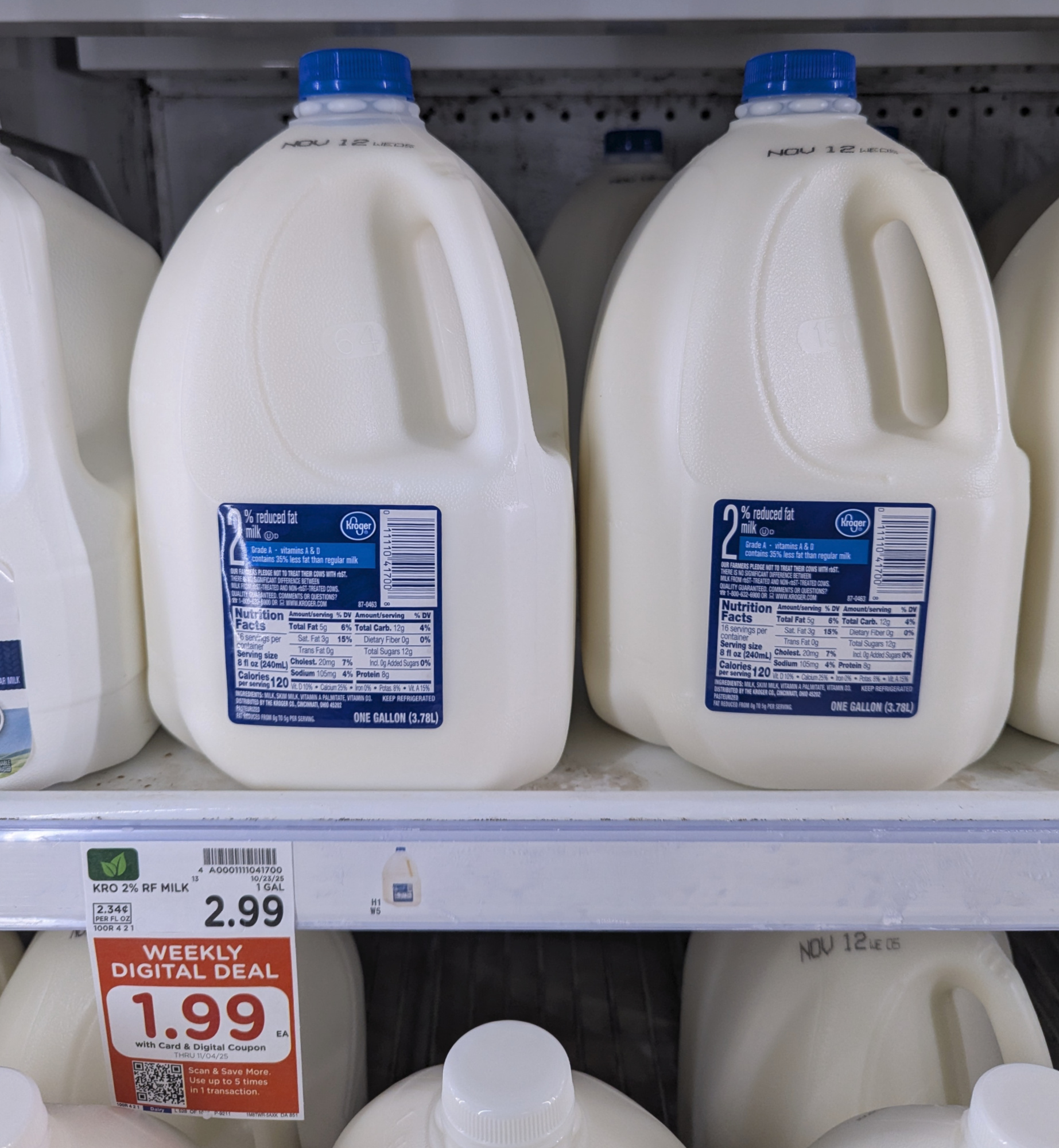 Pick up the gallons of Kroger Milk for just $1.99 with the digital coupon. Get up to FIVE at that price the next time you shop!