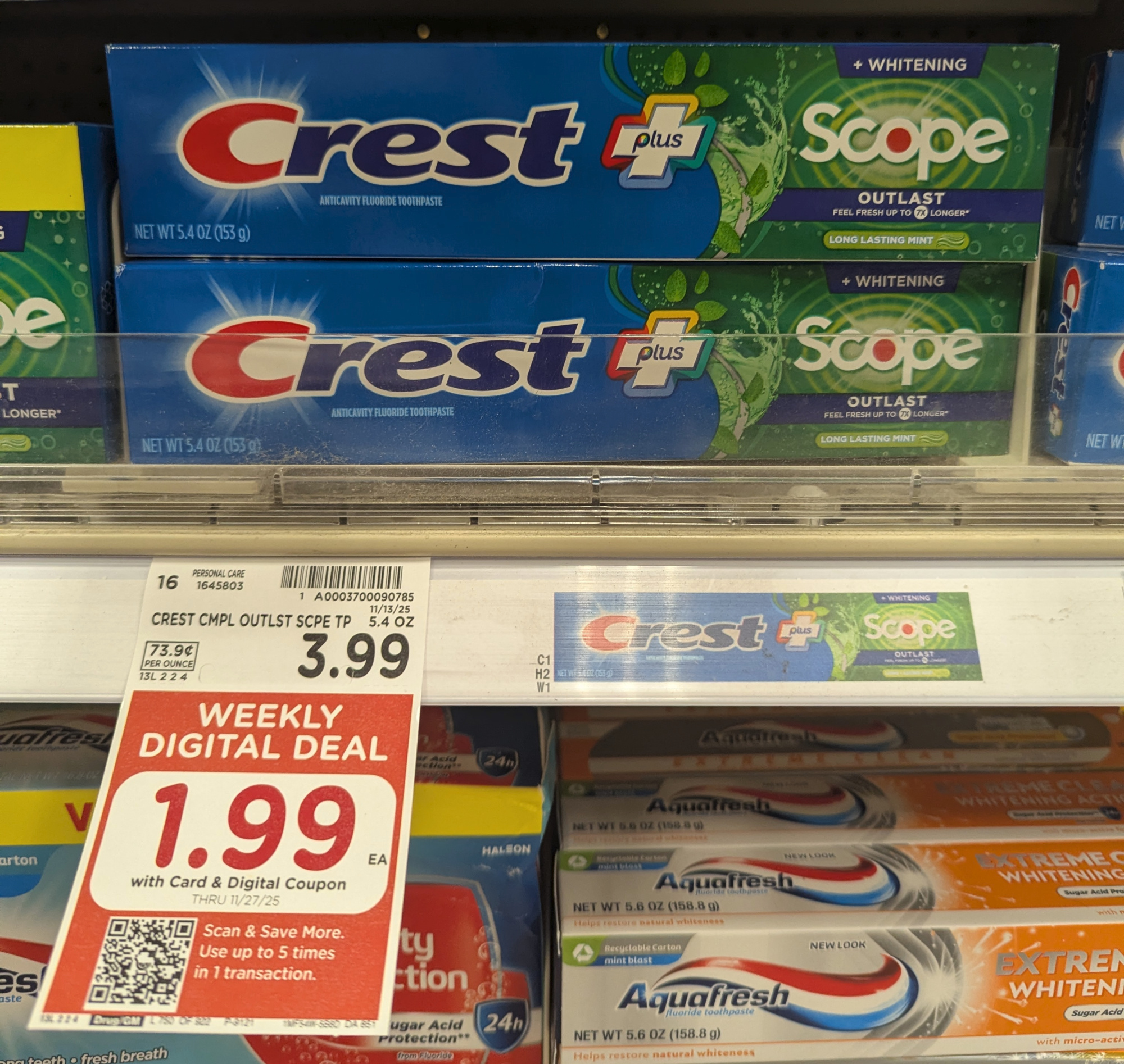 –$2/1 Crest Complete Toothpaste, 5.4 oz, Kroger Super Saver Digital Coupon (use up to 5 times in a single transaction)