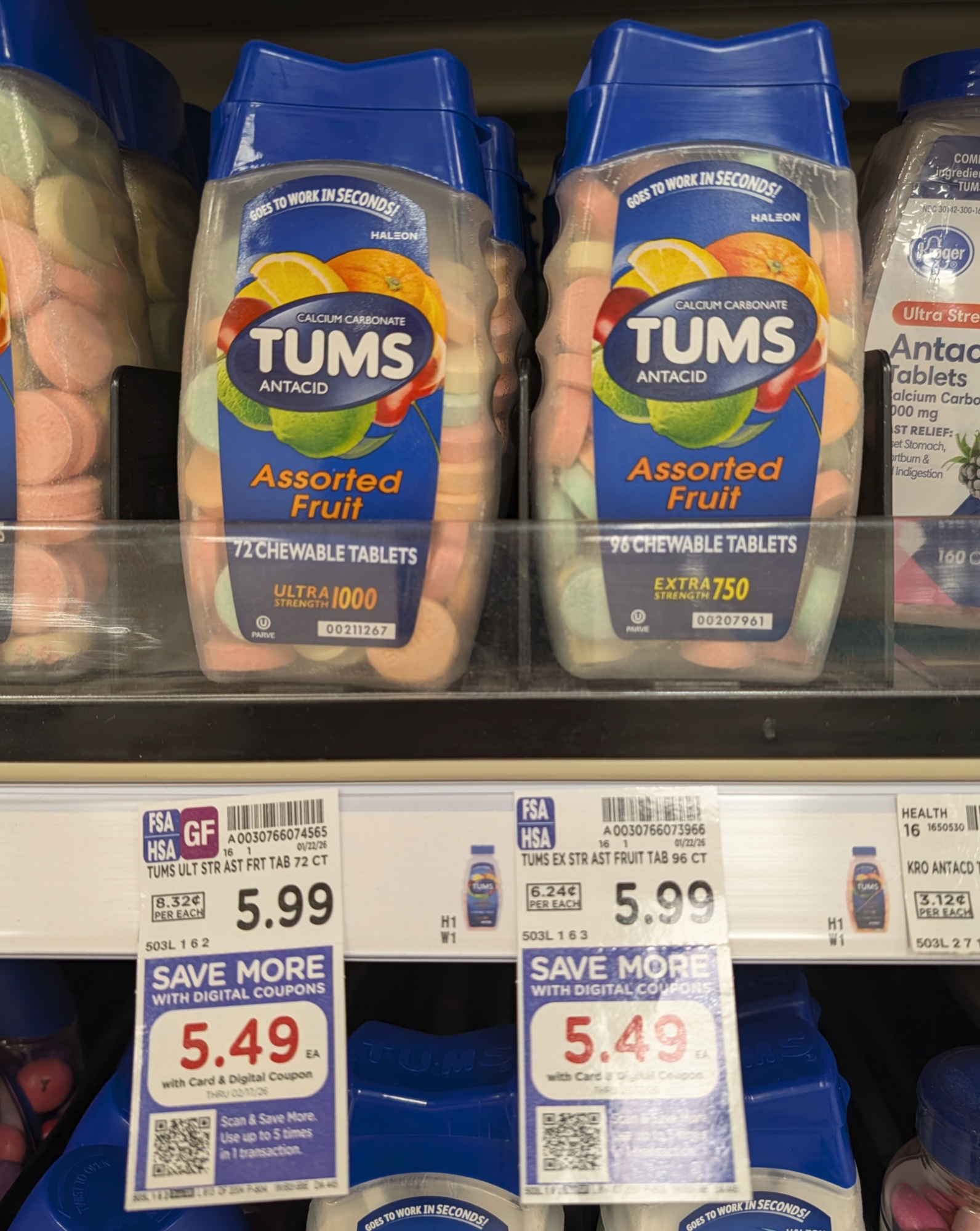 –$0.50/1 Tums Antacid, 28 to 96 ct, Kroger Super Saver Digital Coupon (use up to 5 times in a single transaction)
