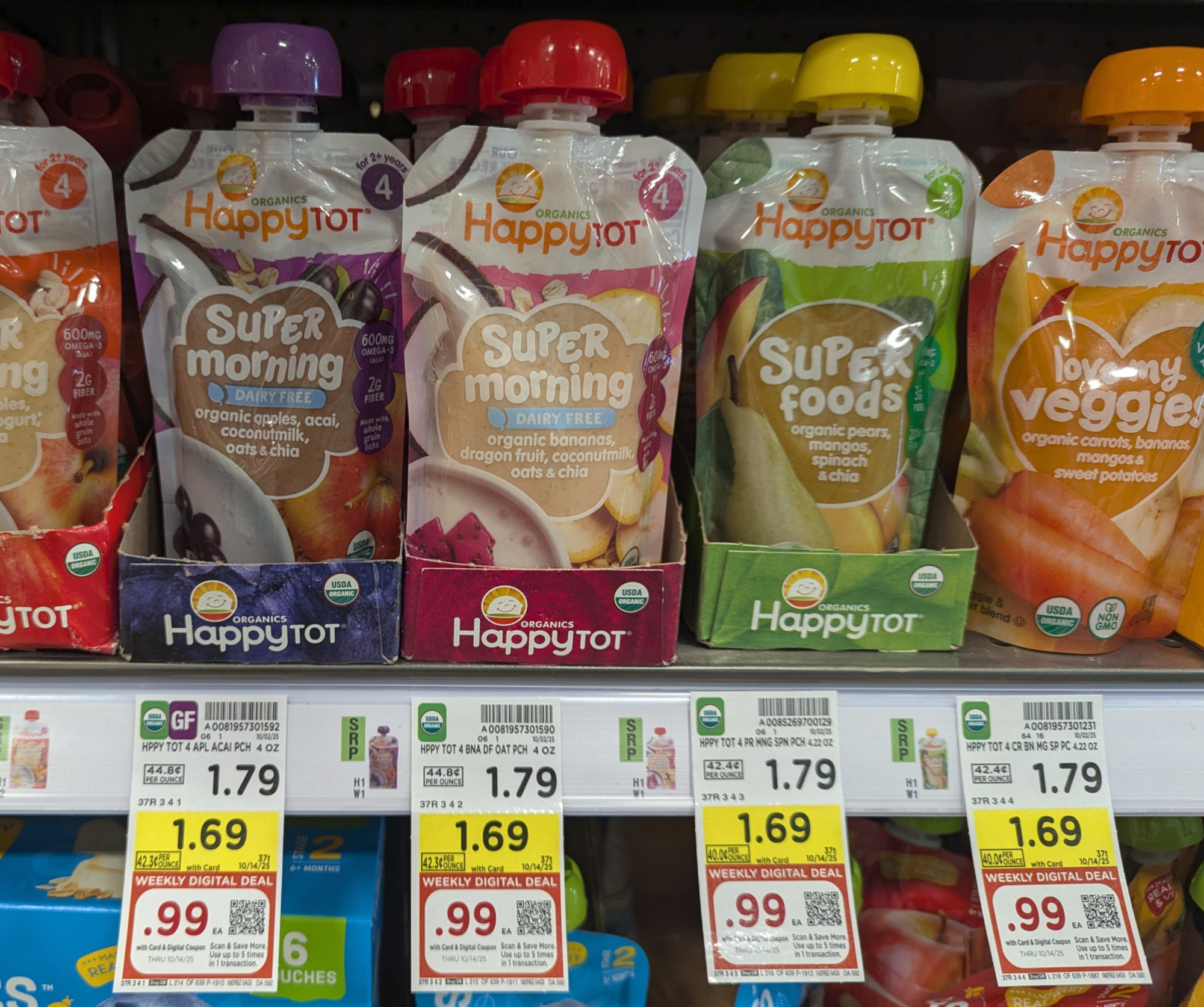 –$0.70/1 Happy Baby, or Happy Tot Baby Food Pouch, 4 to 4.22 oz, Kroger Super Saver Digital Coupon (use up to 5 times in a single transaction)