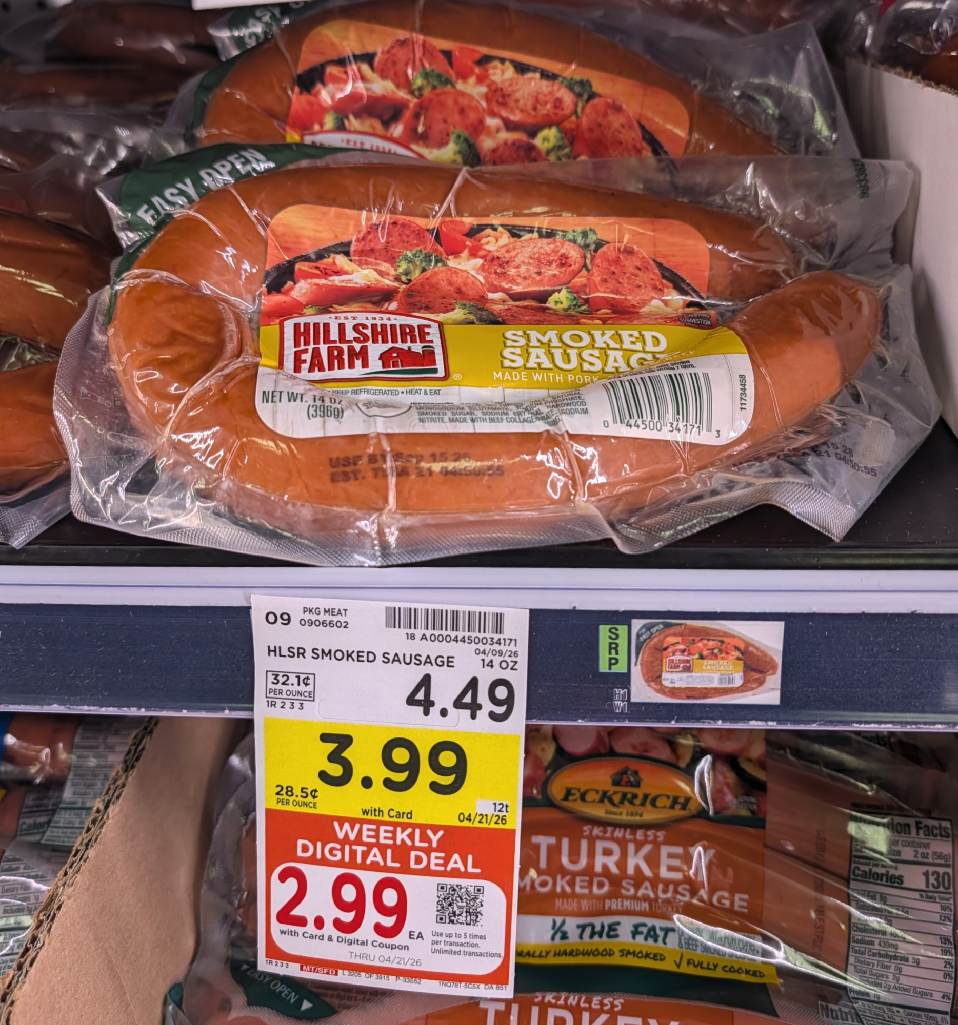 –$1/1 Hillshire Farm Smoked Sausage, 12 to 14 oz, Kroger Super Saver Digital Coupon (use up to 5 times in a single transaction)