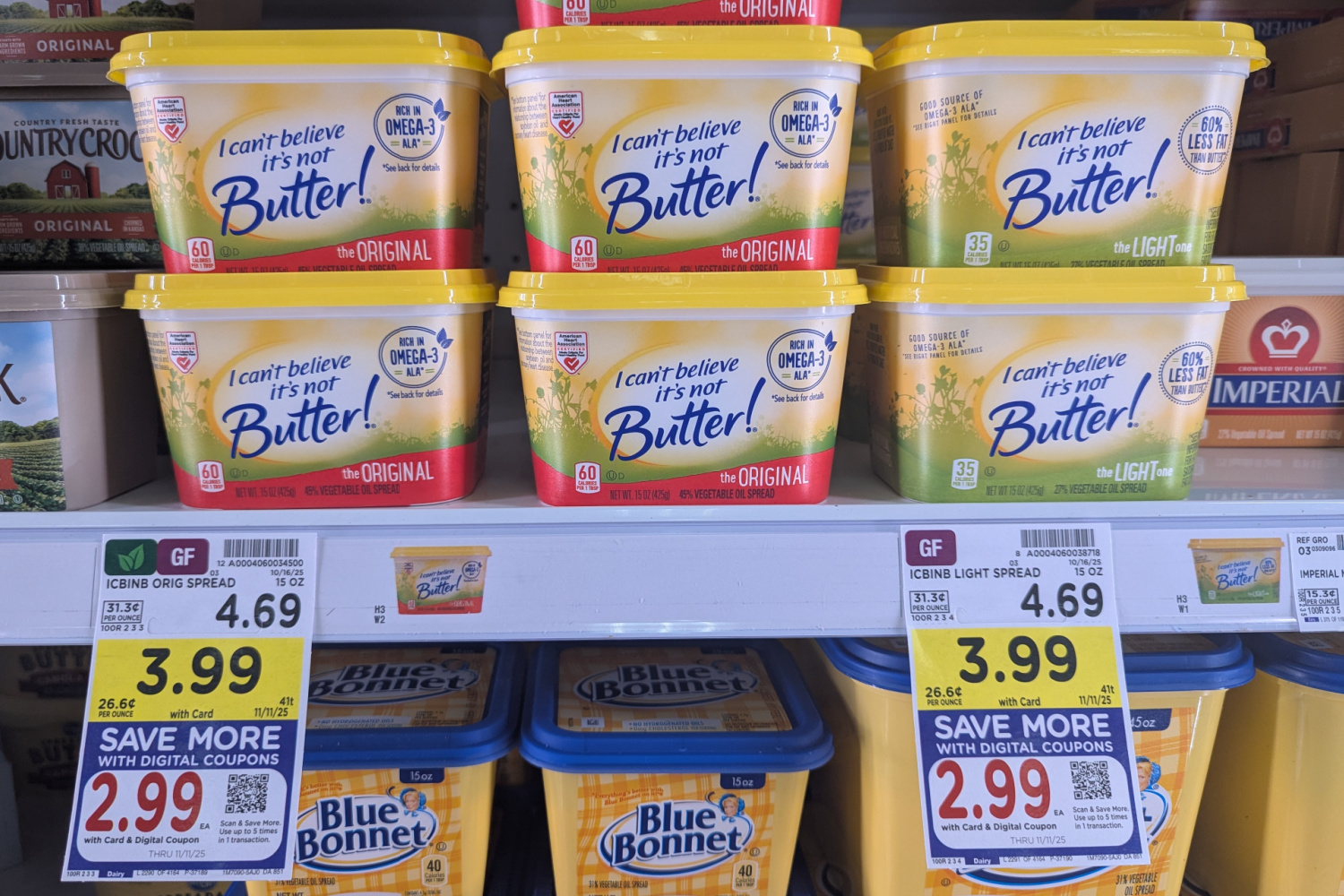 $1/1 I can’t believe it’s not Butter! (8-15 oz) or Brummel & Brown (15 oz).Kroger Super Saver Digital Coupon (use up to 5 times in a single transaction)
