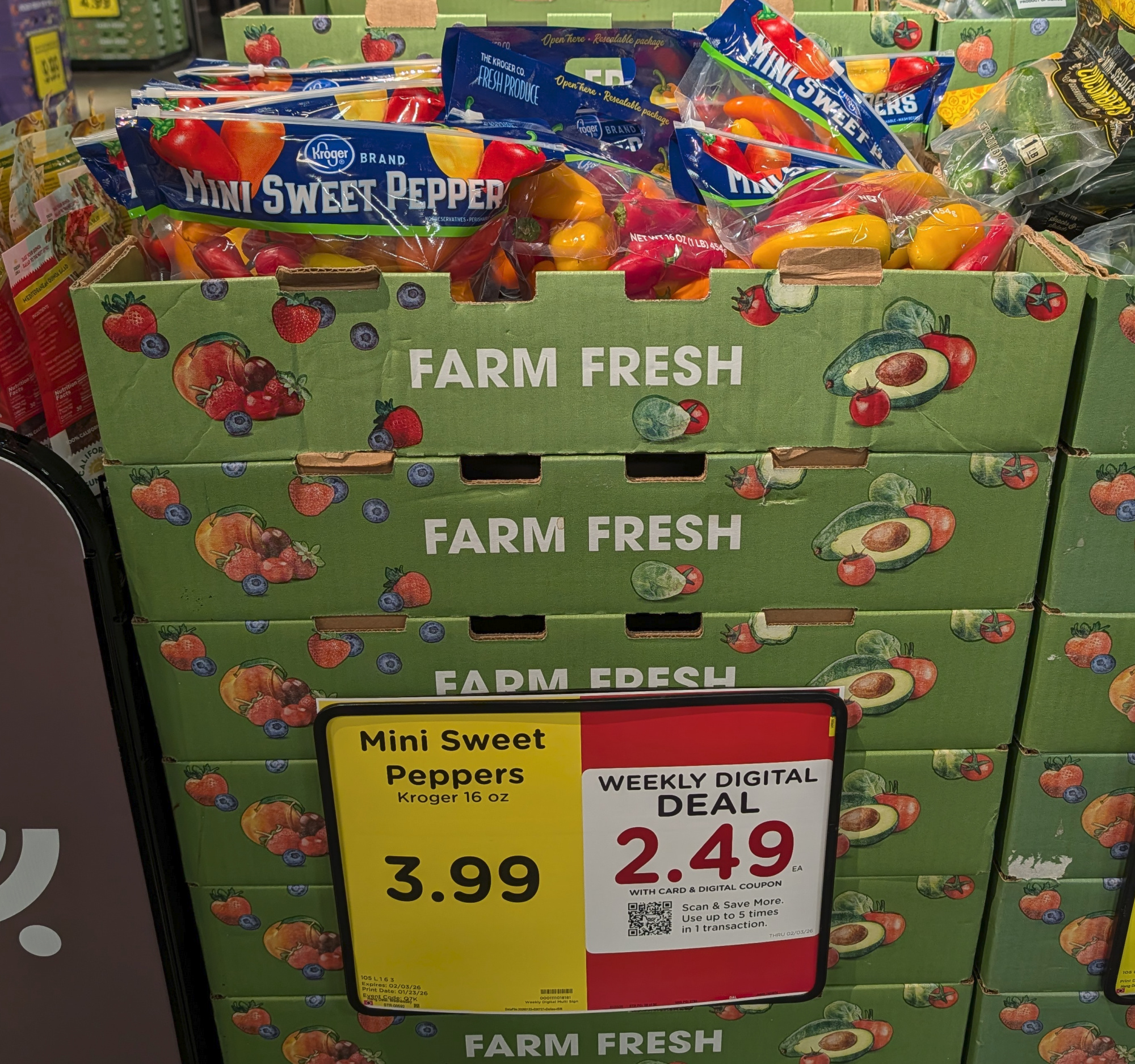It’s a great time to stock up on bags of Kroger Mini Sweet Peppers. Use that big weekly digital coupon to get up to FIVE bags for just $2.49 each.