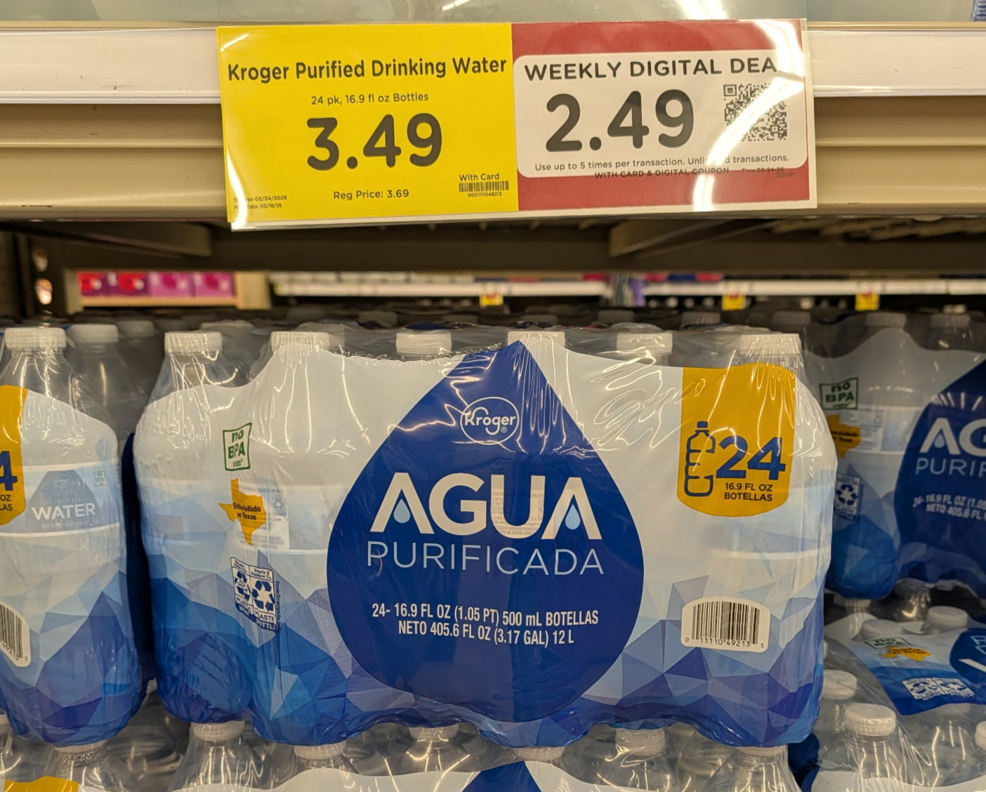 –$1/1 Kroger Purified Water, 24-pk, 16.9 oz, or Natural Spring Water, 24-pk, 16.9 oz, Kroger Super Saver Digital Coupon (use up to 5 times in a single transaction)
