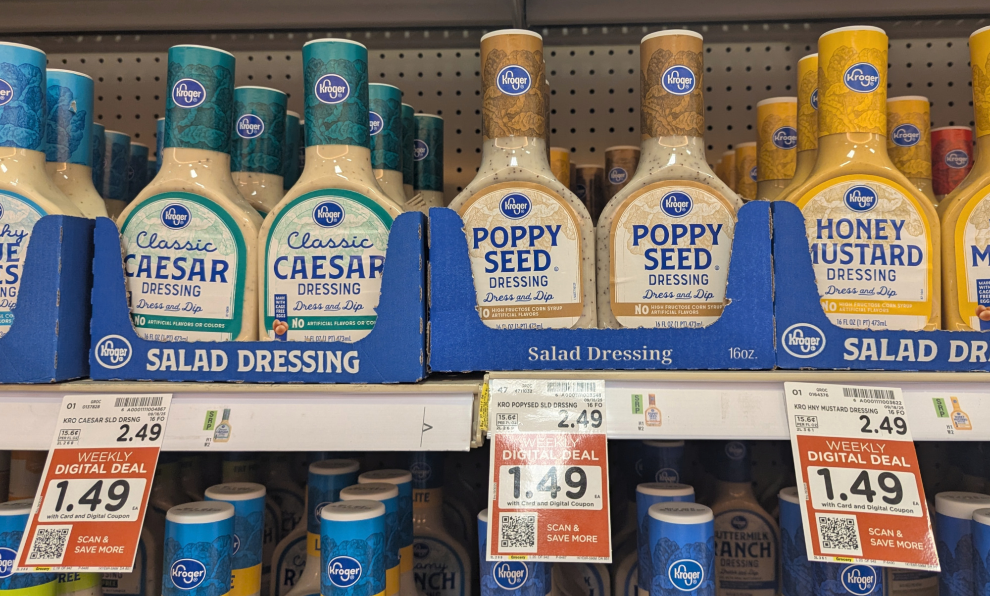 Clip your digital coupon and grab a nice deal on Kroger Dressing. After discounts, you can get up to FIVE bottles for only $1.49 each when you shop this week. Might as well stock up on your faves and save some moolah.