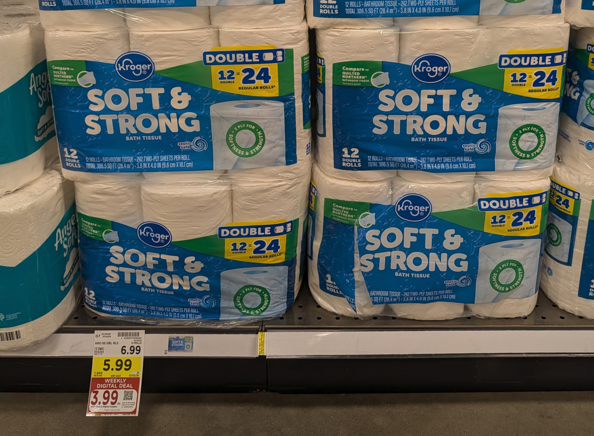 –$2/1 Kroger Soft & Strong Bath Tissue, 12 Double Rolls, Kroger Super Saver Digital Coupon (use up to 5 times in a single transaction)