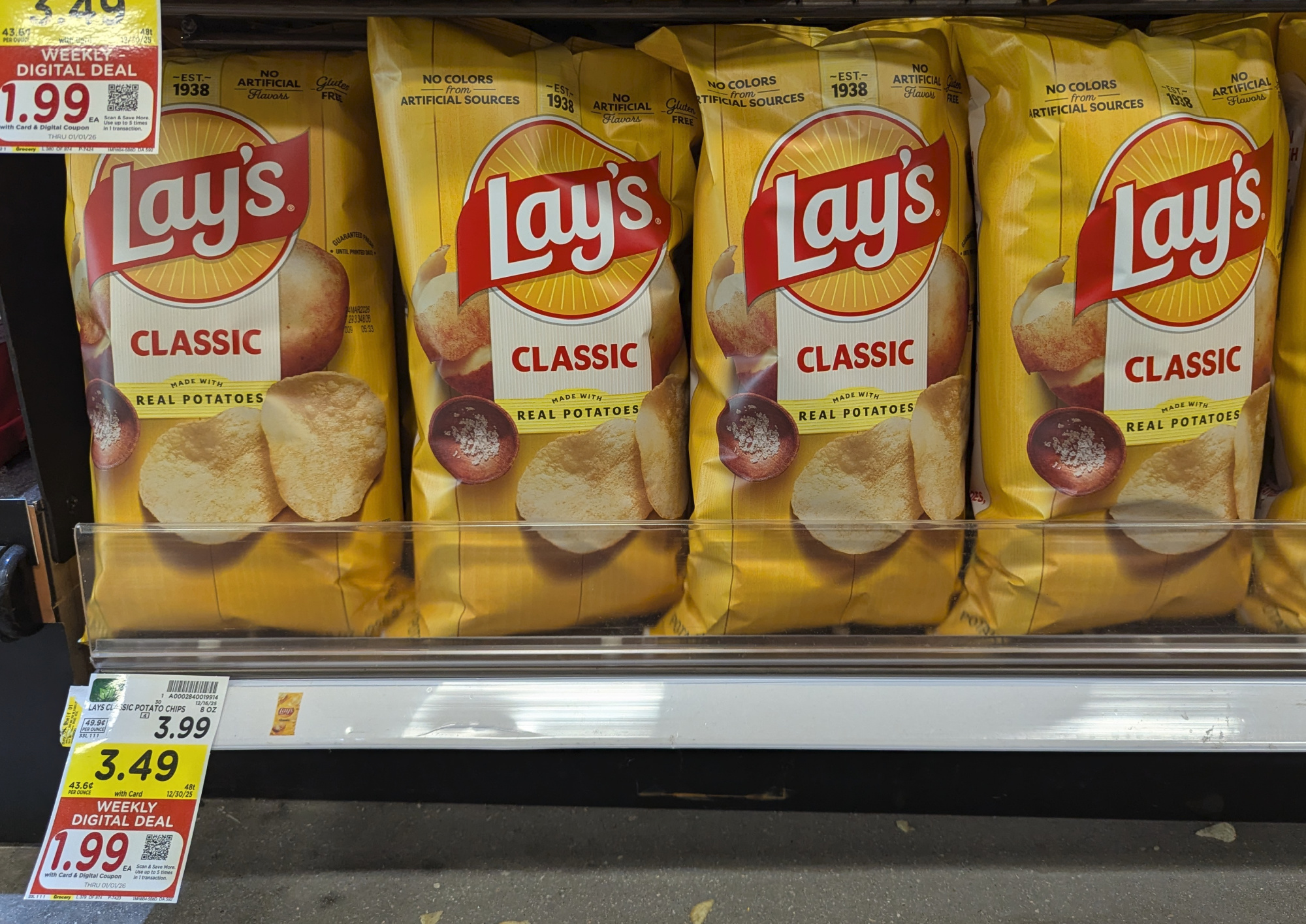 –$1.50/1 Lay’s Potato Chips, 5 to 8 oz, or Kettle Cooked Potato Chips, 8 oz, Kroger Super Saver Digital Coupon (use up to 5 times in a single transaction)