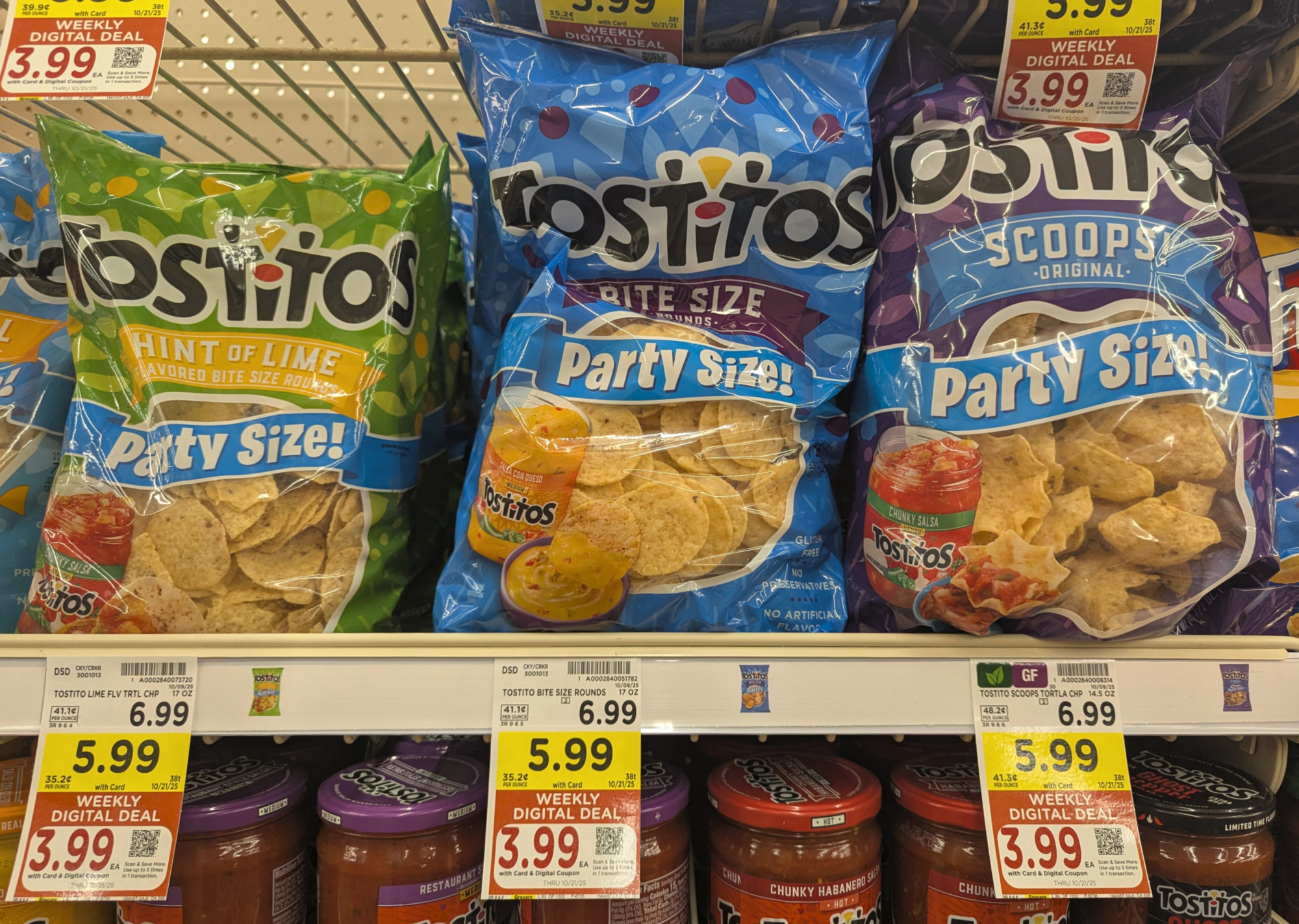 Head over to Kroger for a super deal on Party Size Ruffles or Tostitos. Use the sale and digital coupon and pick up the bags for just $3.99 the next time you shop.