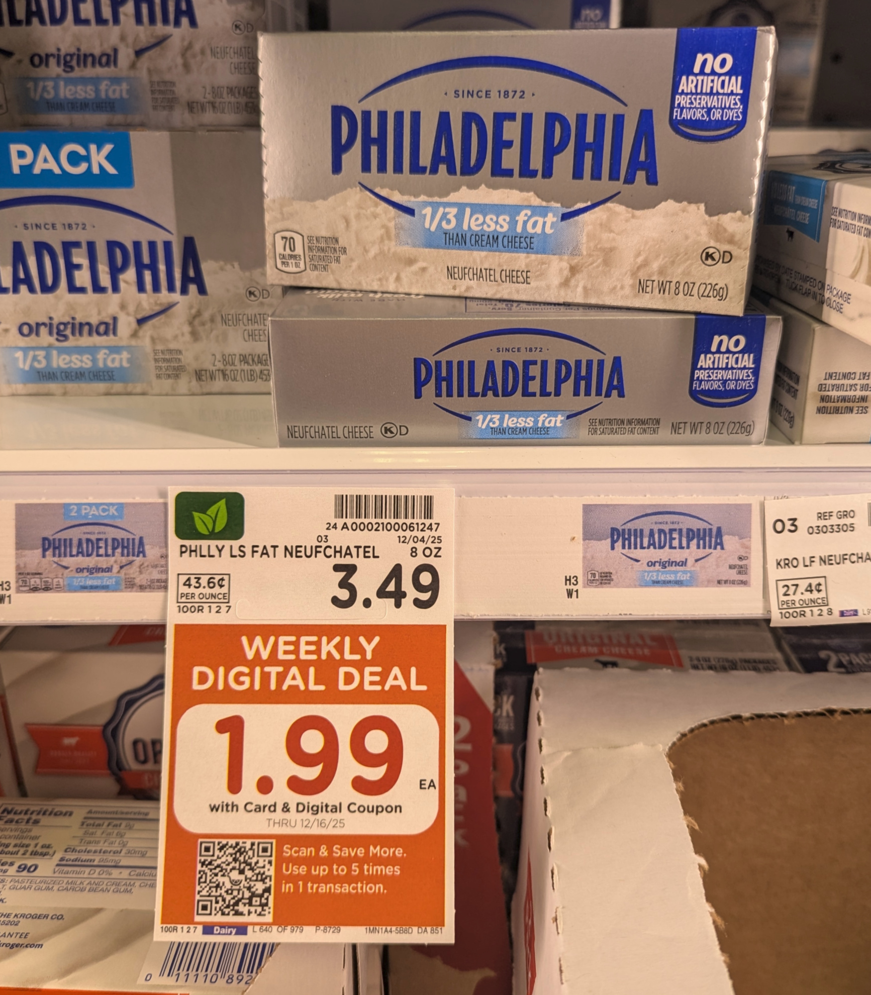 Load the digital coupon to get blocks of Philadelphia Cream Cheese for just $1.99 at Kroger. Get up to FIVE at that price.
