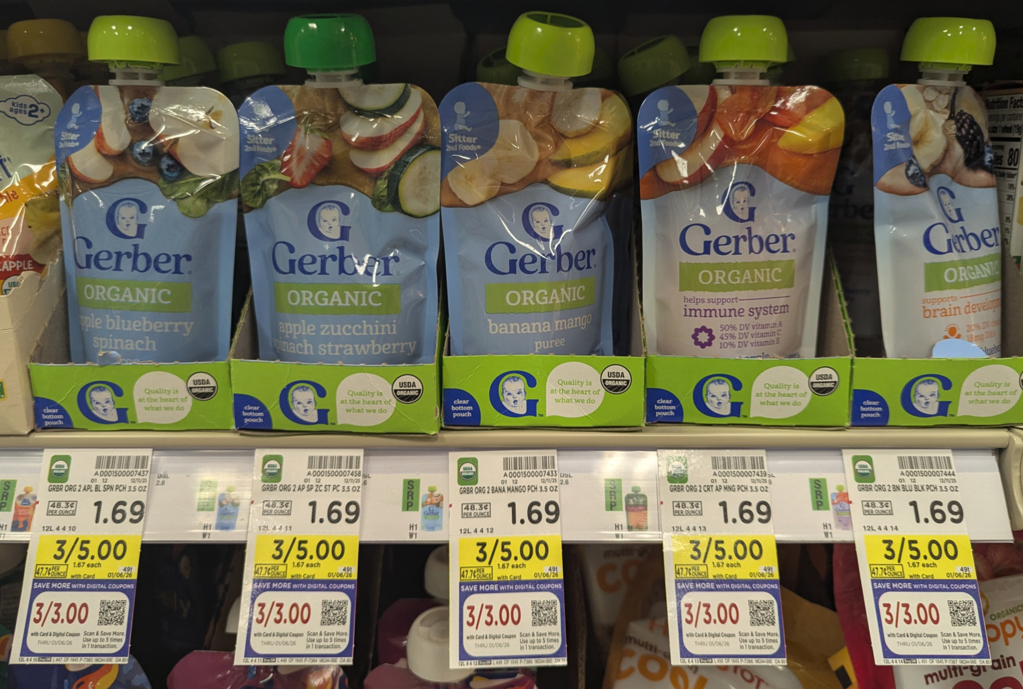 –$2/3 Gerber Organic Pouches, 3.5 oz, Kroger Super Saver Digital Coupon (use up to 5 times in a single transaction)