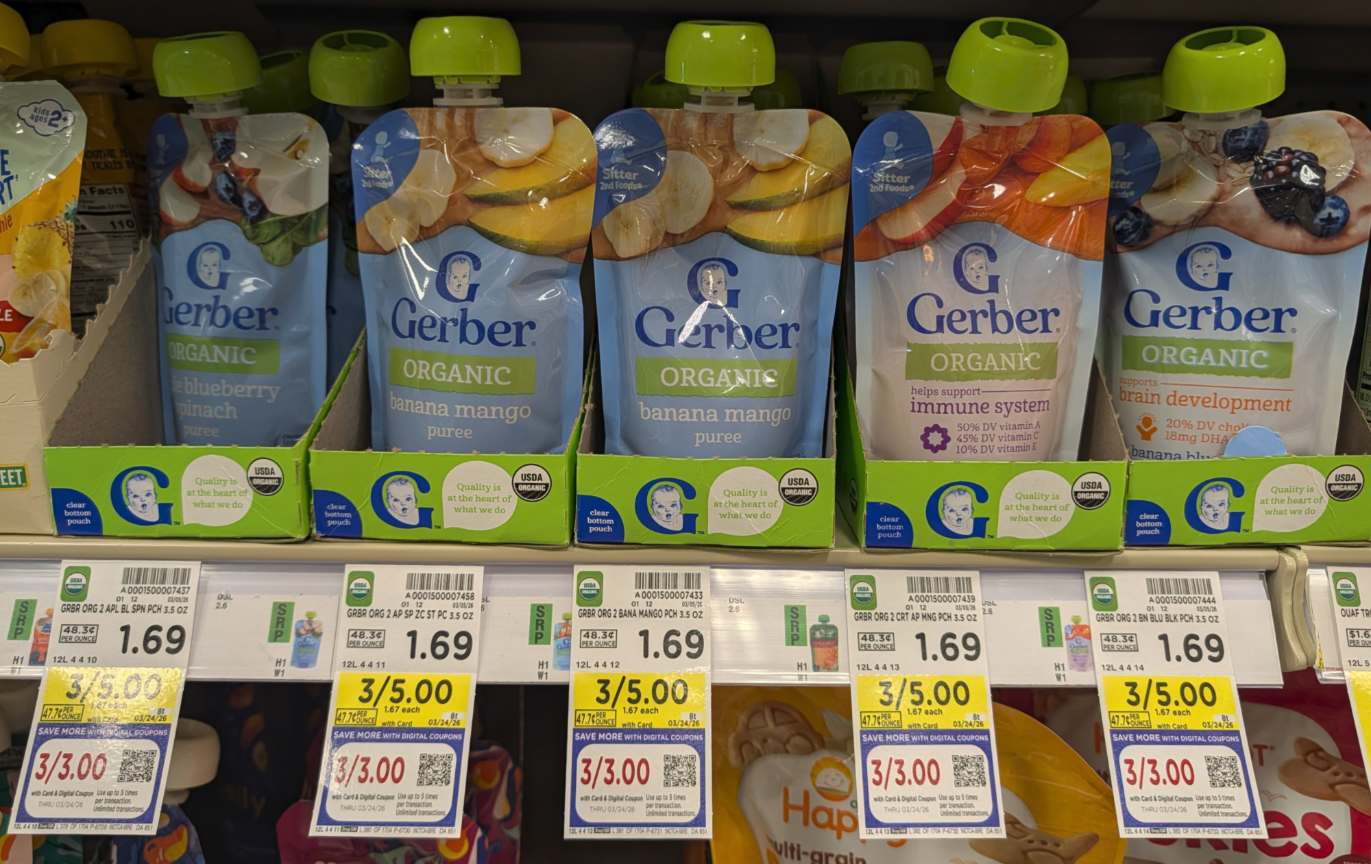 –$2/3 Gerber Organic Pouches, 3.5 oz, Kroger Super Saver Digital Coupon (use up to 5 times in a single transaction)