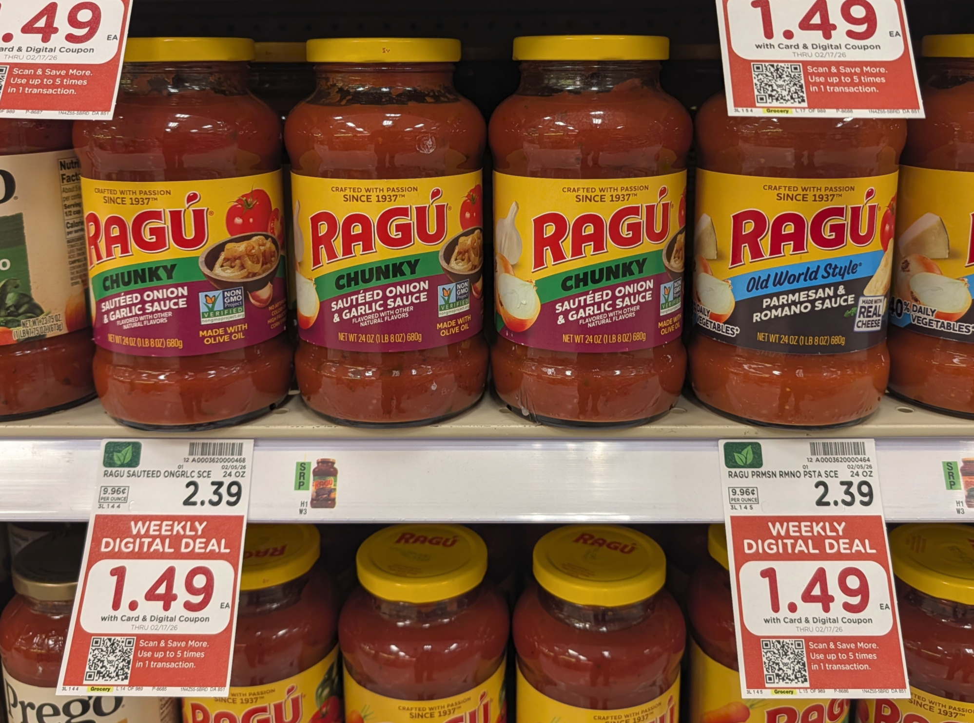 –$0.90/1 Ragu Pasta Sauce, 16 to 24 oz, Kroger Super Saver Digital Coupon (use up to 5 times in a single transaction)