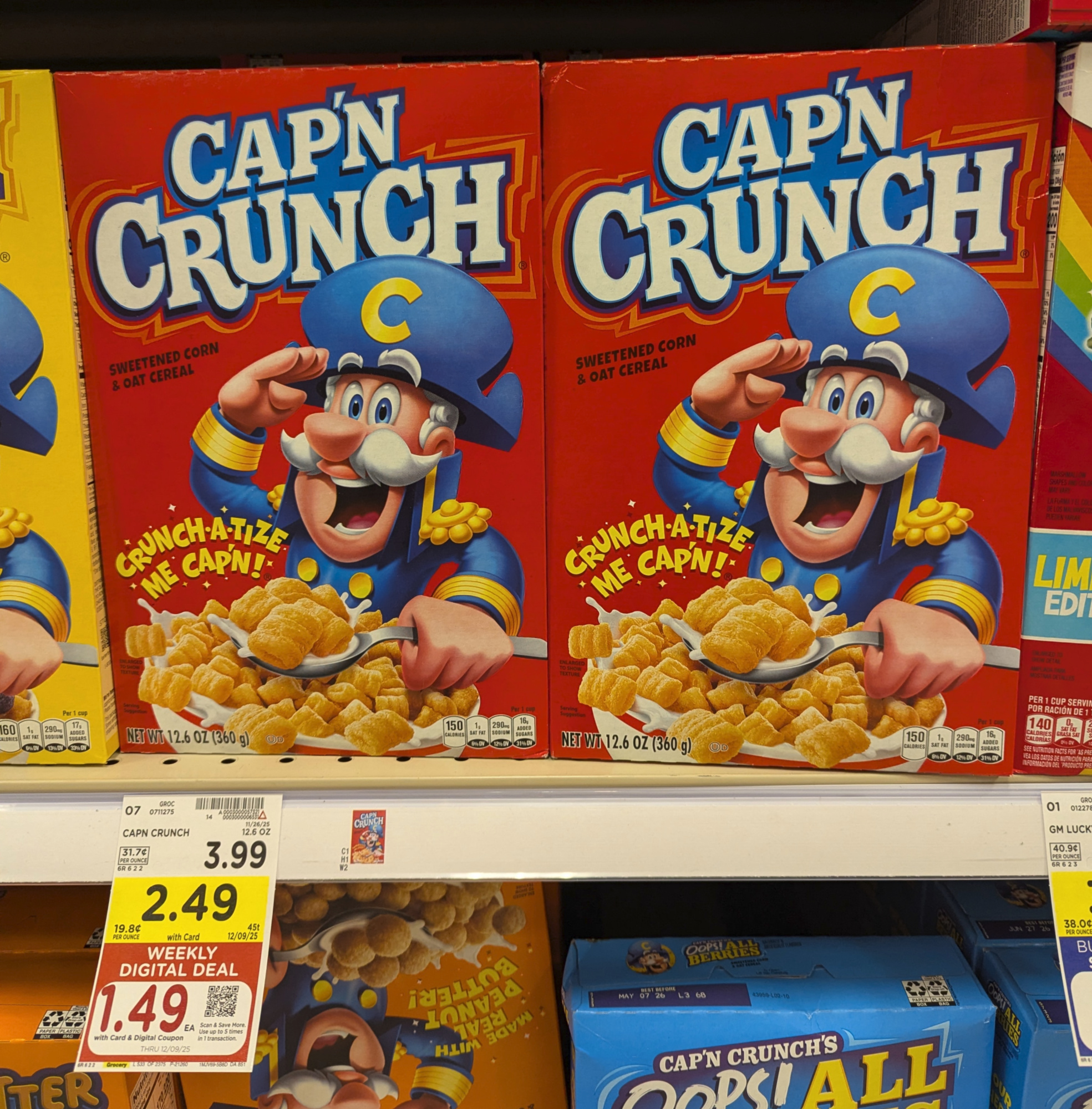 –$1/1 Cap’n Crunch, or Life Cereal, 10.3 to 13 oz, Kroger Super Saver Digital Coupon (use up to 5 times in a single transaction)