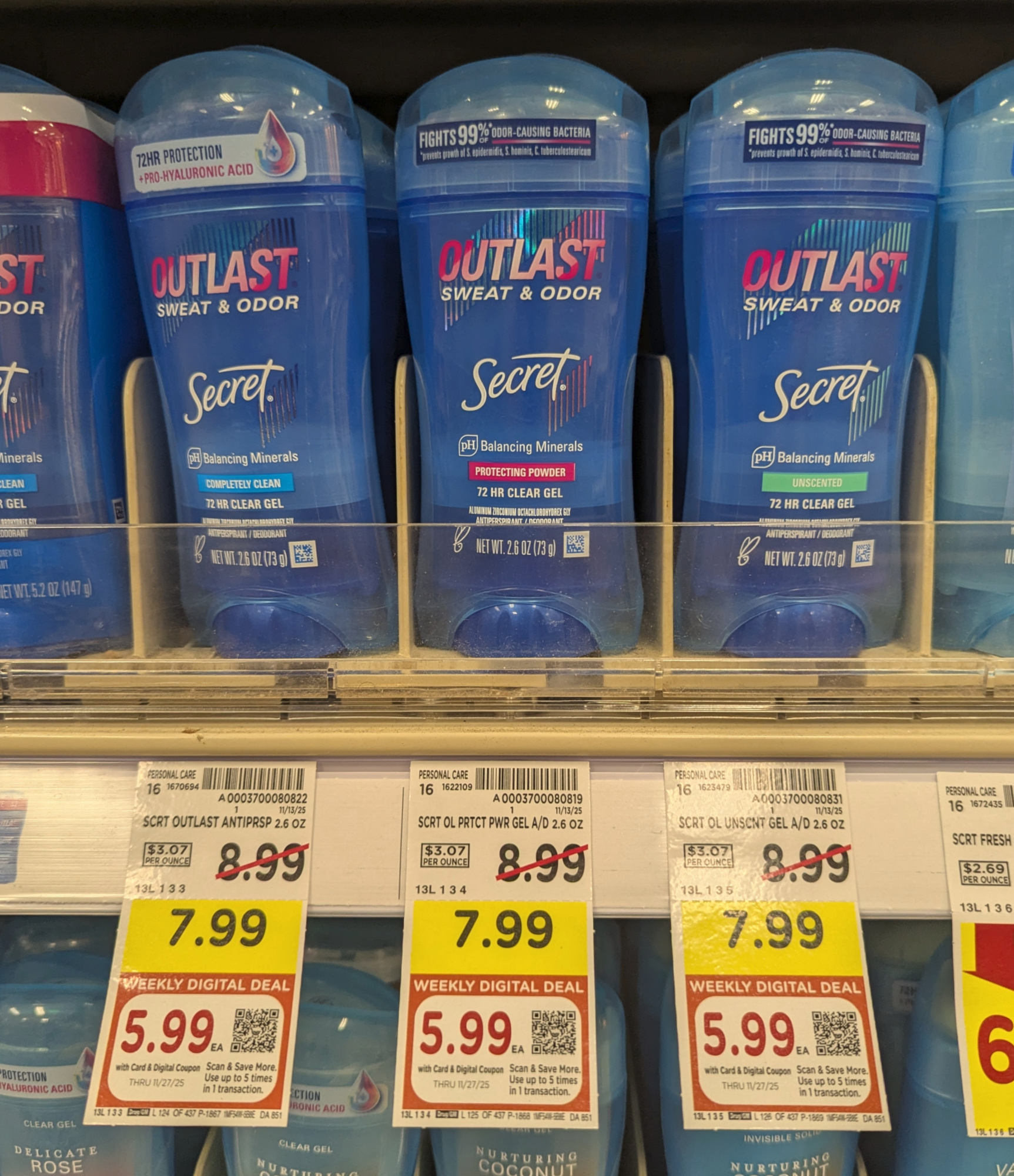 If your family uses Secret Deodorant, look for a nice deal at Kroger. After discounts you can get a couple of sticks of deodorant for as little as $4.49 each!