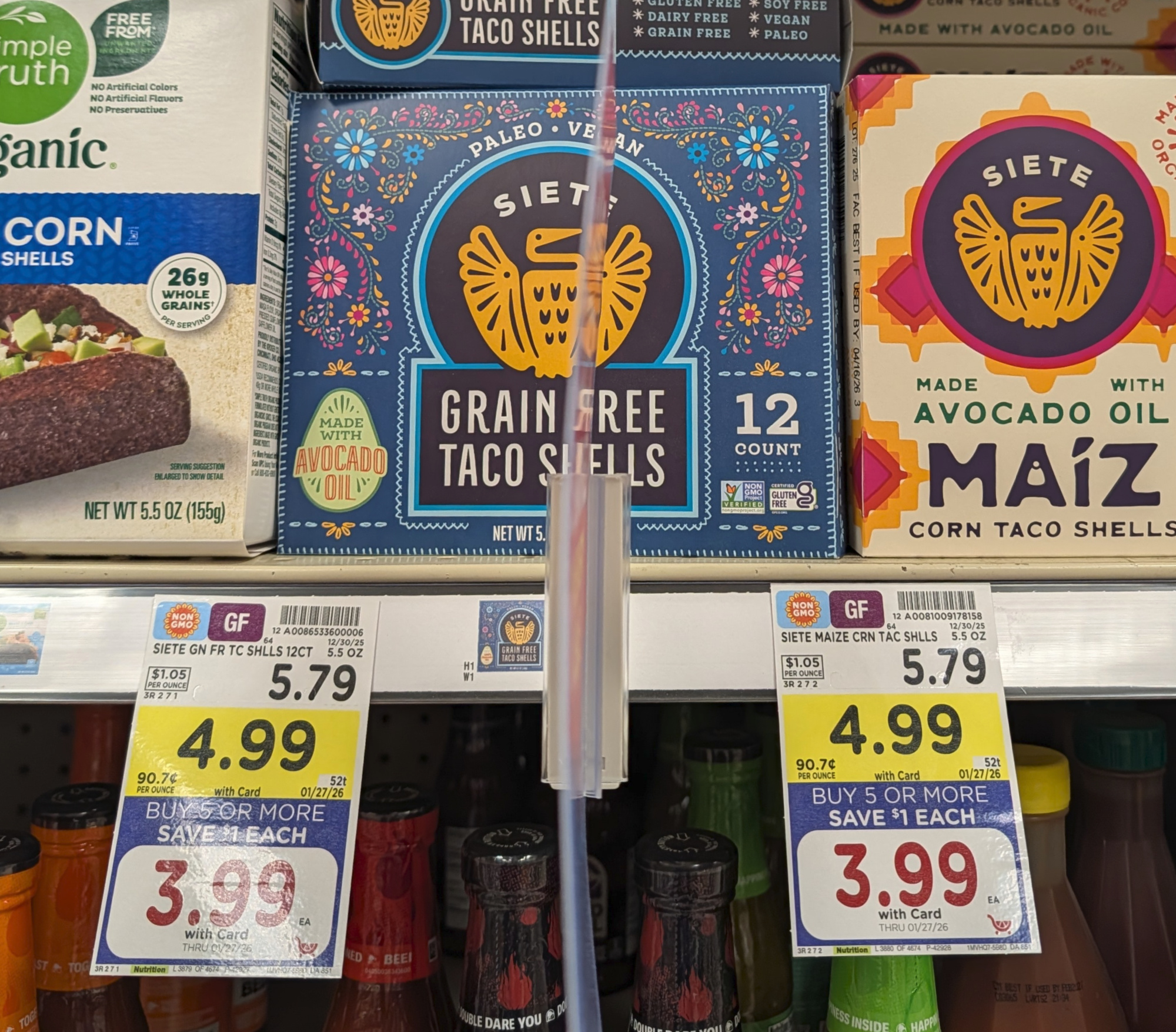 In addition to the cheap Siete Chips, you can also pick up a deal on Siete Taco Shells. After discounts, you pay as little as $2.49 per box.