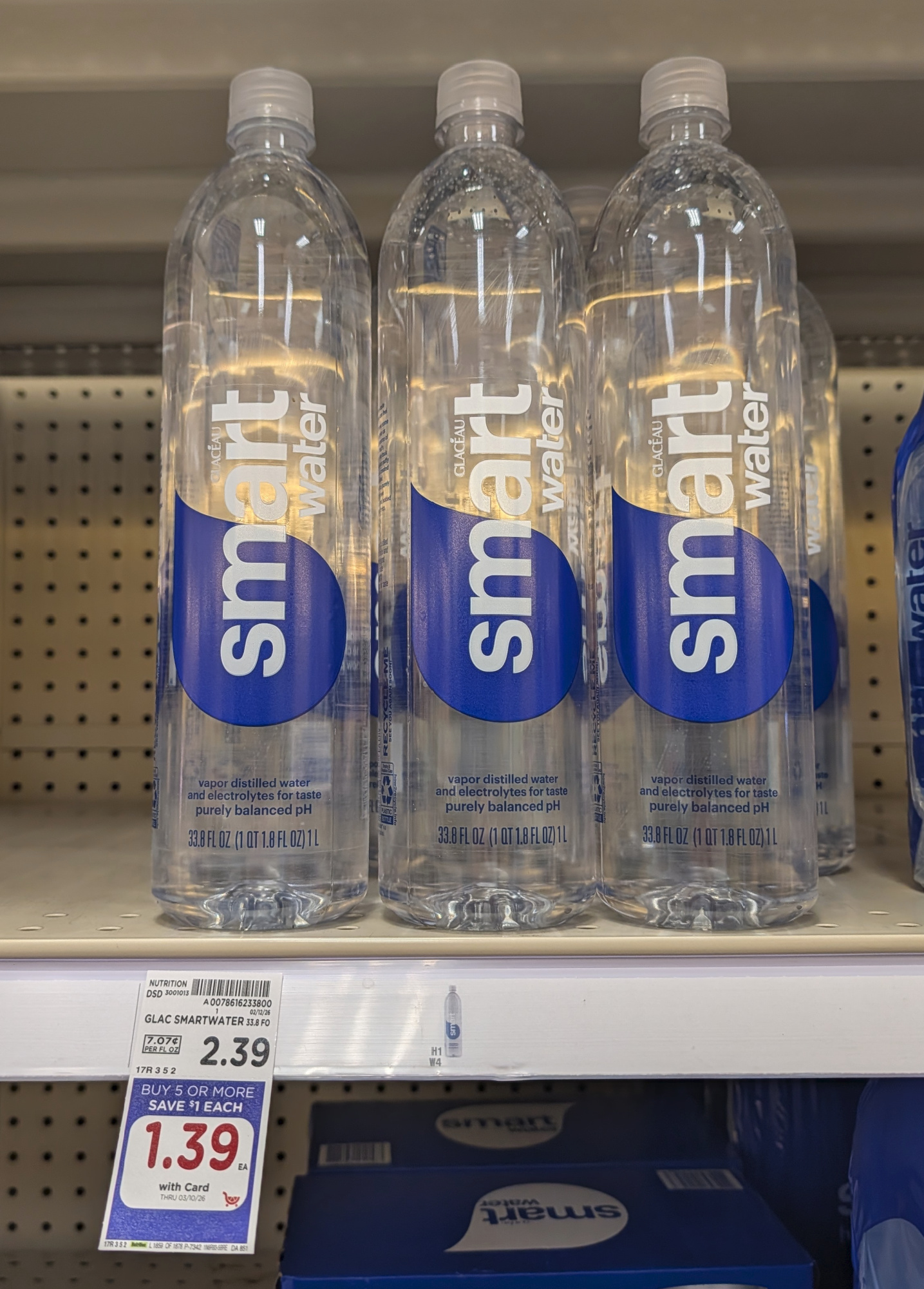 Smartwater, 1-L, $1.39 (reg $2.39) – through 3/10