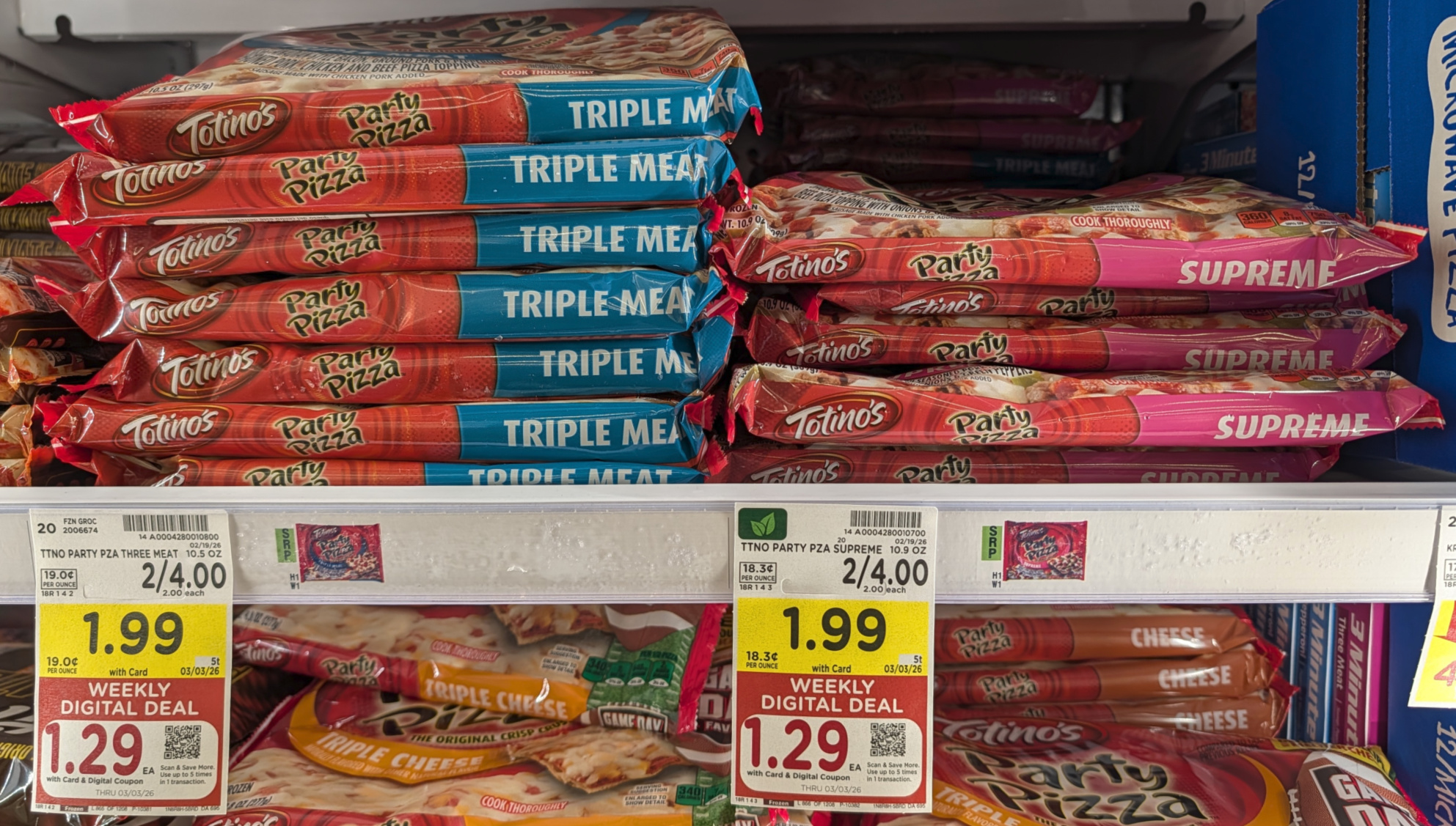 $0.70/1 Totino’s Party Pizza, 9.8 to 10.9 oz, Kroger Super Saver Digital Coupon (use up to 5 times in a single transaction)